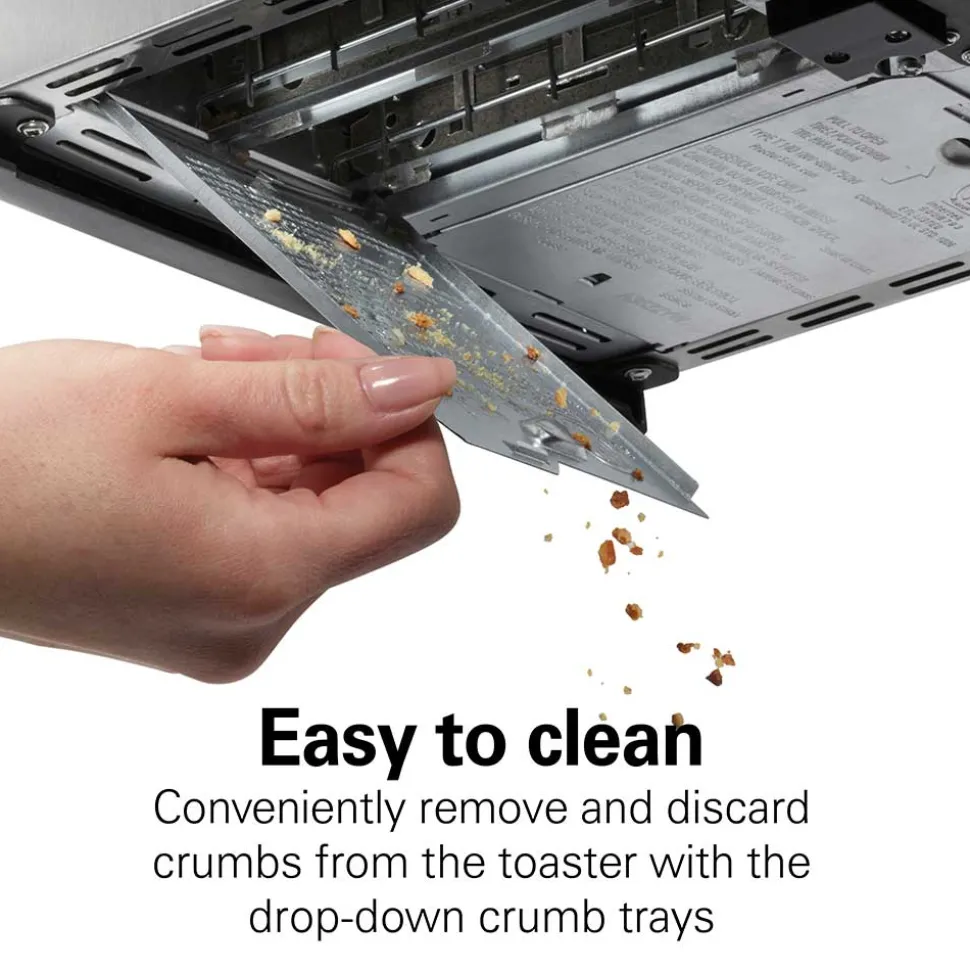 The bagel buttons extend the toasting time so bagels turn out warm and delicious every time. Toast Boost lets you lift small breads and waffles higher so they’re easier to retrieve from the toaster. No more struggling to get your toasted English muffins and gluten-free slices out of the toaster. The toaster has self-centering bread guides that hold each slice of bread upright and centered within the slot, so bread is evenly warmed and toasted by the heating elements. The 4 slice toaster is easy to clean with 2 drop-down crumb trays. For peace of mind, the toaster automatically shuts off at the end of the toasting cycle, even if toast gets jammed.