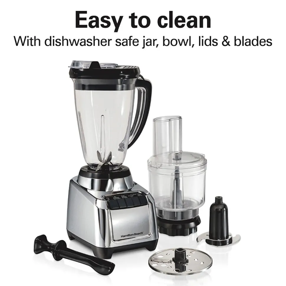 The large, BPA-free MultiBlend® jar is perfect for blending both icy drinks, like fruit smoothies and protein shakes, and for prepping foods like soups, dips, batters, dressings and sauces. Easily swap the jar for the 3 cup food processor attachment to chop fresh vegetables or mince garlic for a stir fry. The food processor bowl includes a chute and food pusher to make adding foods easy. The blender jar, food processor bowl, lids, blades and accessories are all dishwasher safe for easy cleanup. Built for long-lasting performance and backed by Hamilton Beach with a 3 year limited warranty.