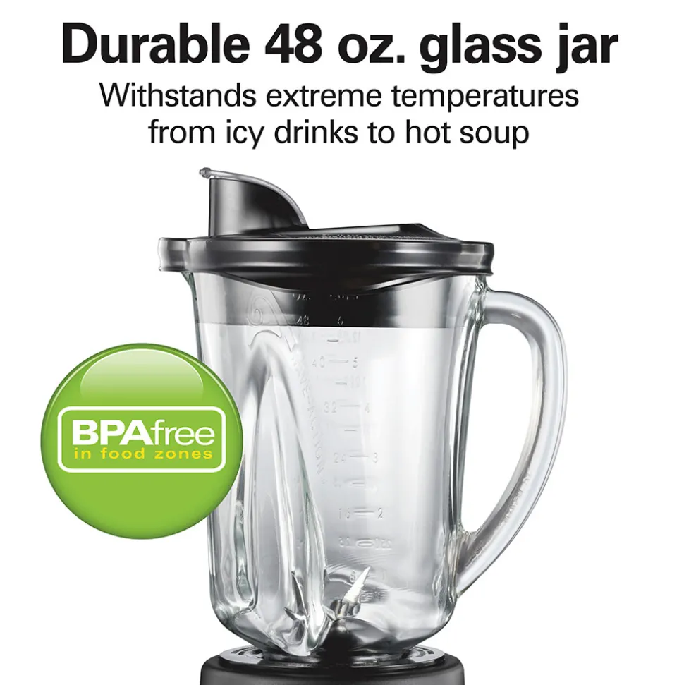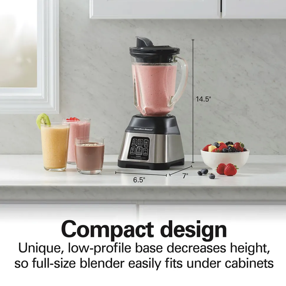 For easy blending operation and cleanup, the easy-to-clean electronic touchpad has blending functions including Ice Crush, Quick Clean, Icy Drink and Auto Smoothie. The sleek, compact design easily fits under your cabinet and it’s small enough to fit on a shelf or inside a cabinet for easy storage. Powerful blending performance is assured with 850 watts of peak blending power and stainless steel Ice Sabre® blades. Includes dishwasher safe 48 oz. glass jar and lid. Backed by Hamilton Beach with a 3 year limited warranty.