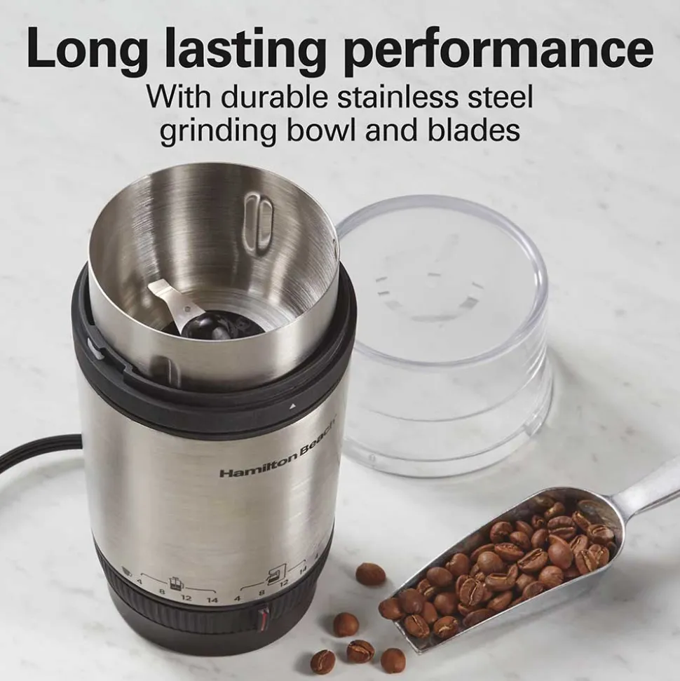 With the Hamilton Beach® Stainless Steel Custom Grind™ Coffee Grinder, it’s easy to grind just the right amount of coffee beans to the perfect grind size for your coffee, whether you need coarse ground coffee for French Press, medium grind for drip coffee or finely ground for espresso. Simply turn the patent pending adjustable selection ring to choose your grind size and cups of brewed coffee to make between 4 and 14 cups. To grind coffee hands-free, just press the top of the grinder and release.