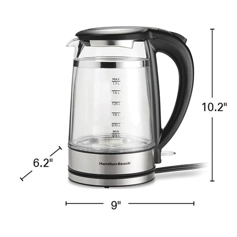 Brighten every morning with the Hamilton Beach® 1.7 L Insulated Kettle. It’s insulated to keep water warm 29% longer* and has LED lights that change color as the water heats up. Not only is it fun to watch the lights turn from purple (cold water) to red (hot water) as the water heats, they show you at a glance the water’s current temperature. For worry-free use and fast boiling, the kettle has a BPA-free glass and stainless steel interior and 1500 watts of power.