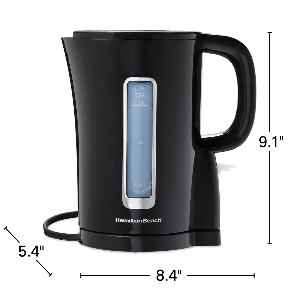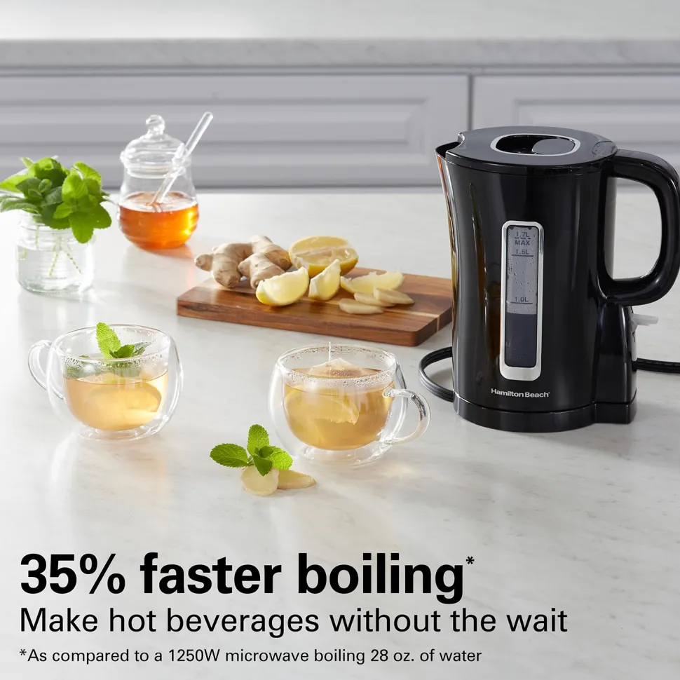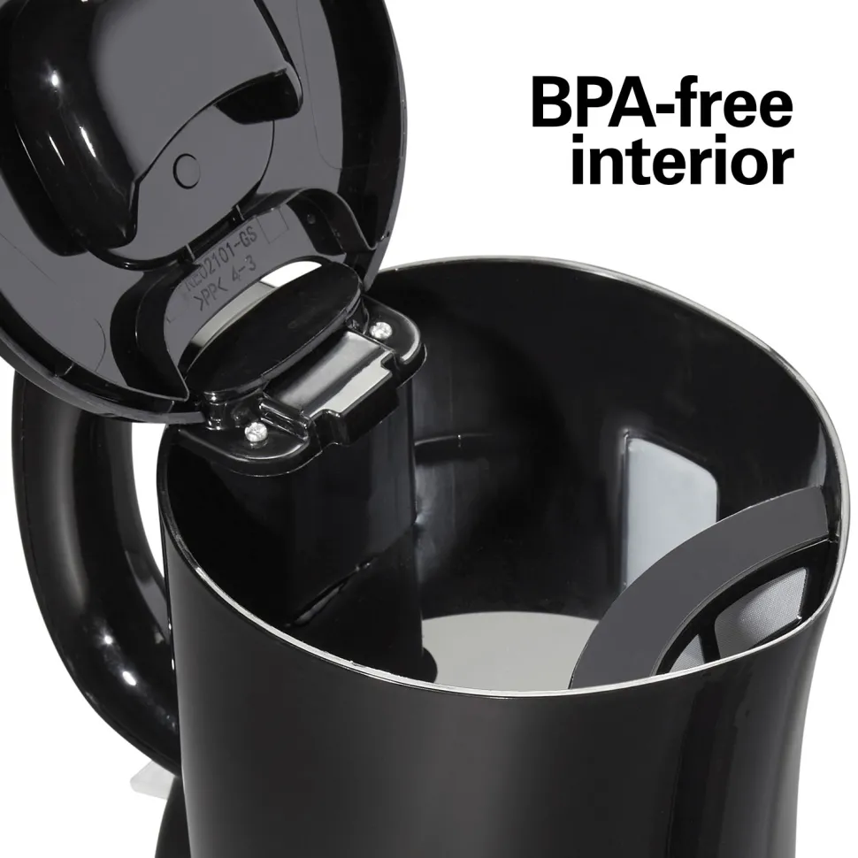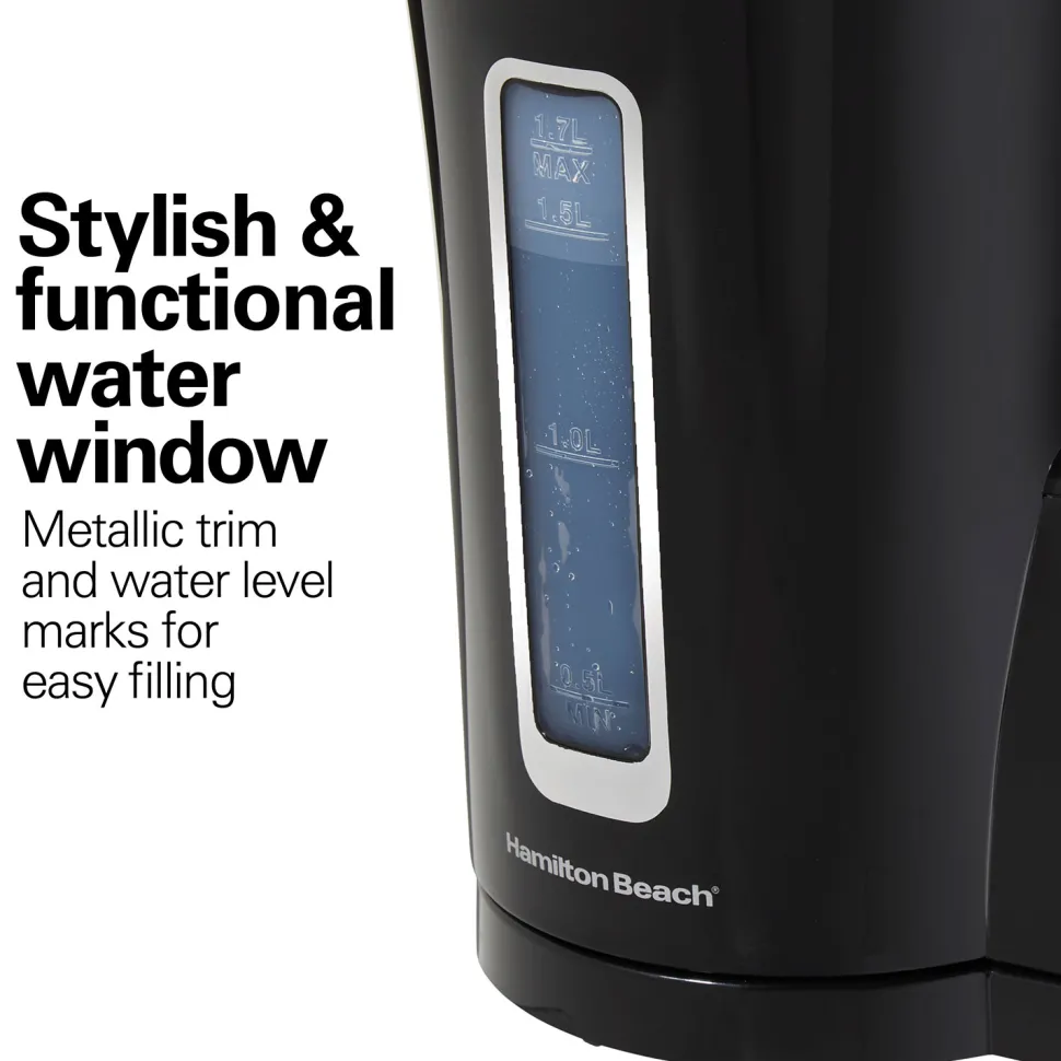Bring style and performance to your kitchen with the Hamilton Beach® 1.7 L Electric Kettle. This attractive black kettle has stylish metallic trim that complements any decor, and it features automatic shutoff for peace of mind. For worry-free operation and rapid boiling, the kettle has a BPA-free interior and 1500 watts of power for 35% faster boiling.* It’s fast and easy to use. Simply fill with water and flip down the on/off switch near the base.