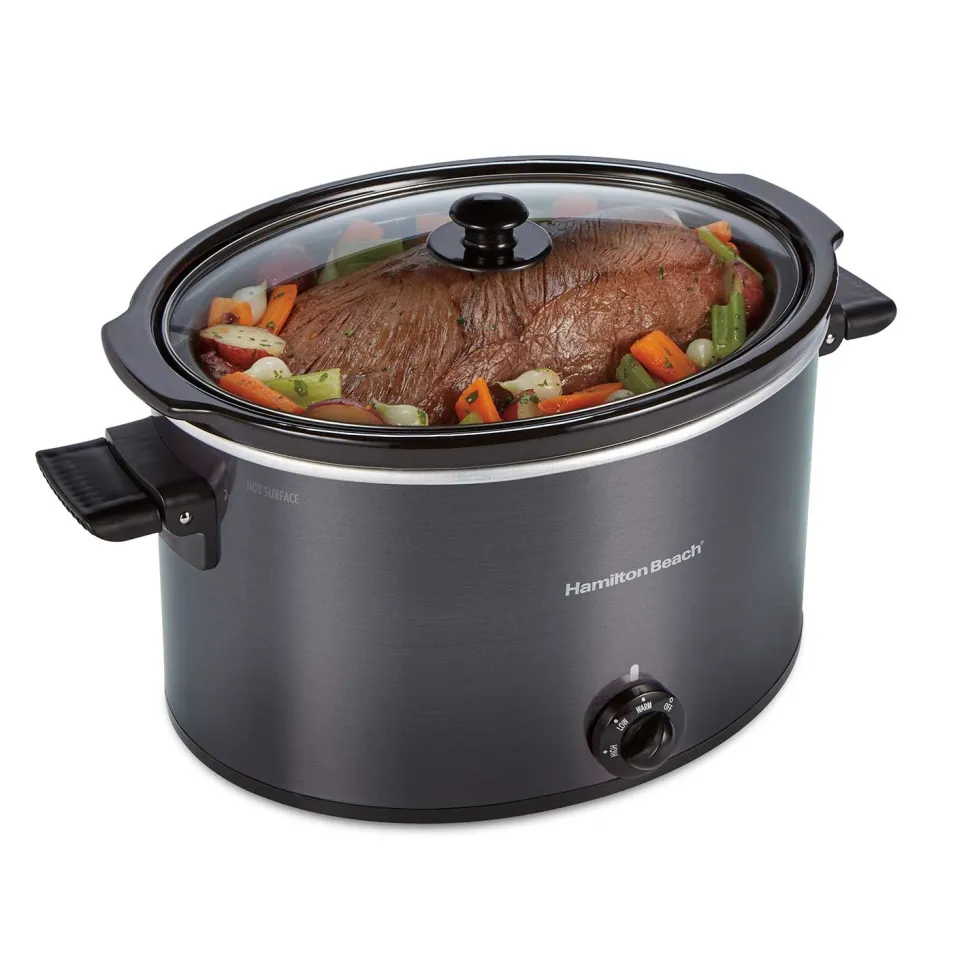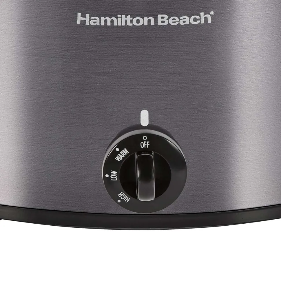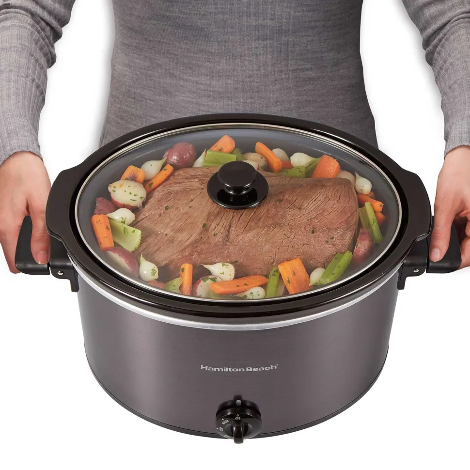 The Hamilton Beach® 10 Quart Slow Cooker’s extra-large capacity is perfect for everything from game-day chili to your Thanksgiving turkey. The oval-shaped stoneware crock can fit up to a 10 lb. turkey or 12 lb. roast and is perfect for large-batch soups and stews. This slow cooker features low and high cook settings and a warm setting, ideal for buffets or when dinner ends up later than you planned. Full-grip, folding handles make it easy to carry, and both the stoneware crock and glass lid are dishwasher safe.