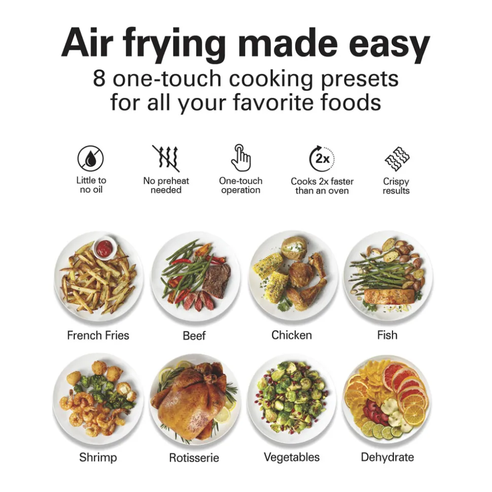 One touch is all it takes to air fry, cook, dehydrate or rotisserie a wide variety of food. The 8 one-touch presets include French fries, beef, chicken, fish, shrimp, rotisserie, vegetables and dehydrate.
