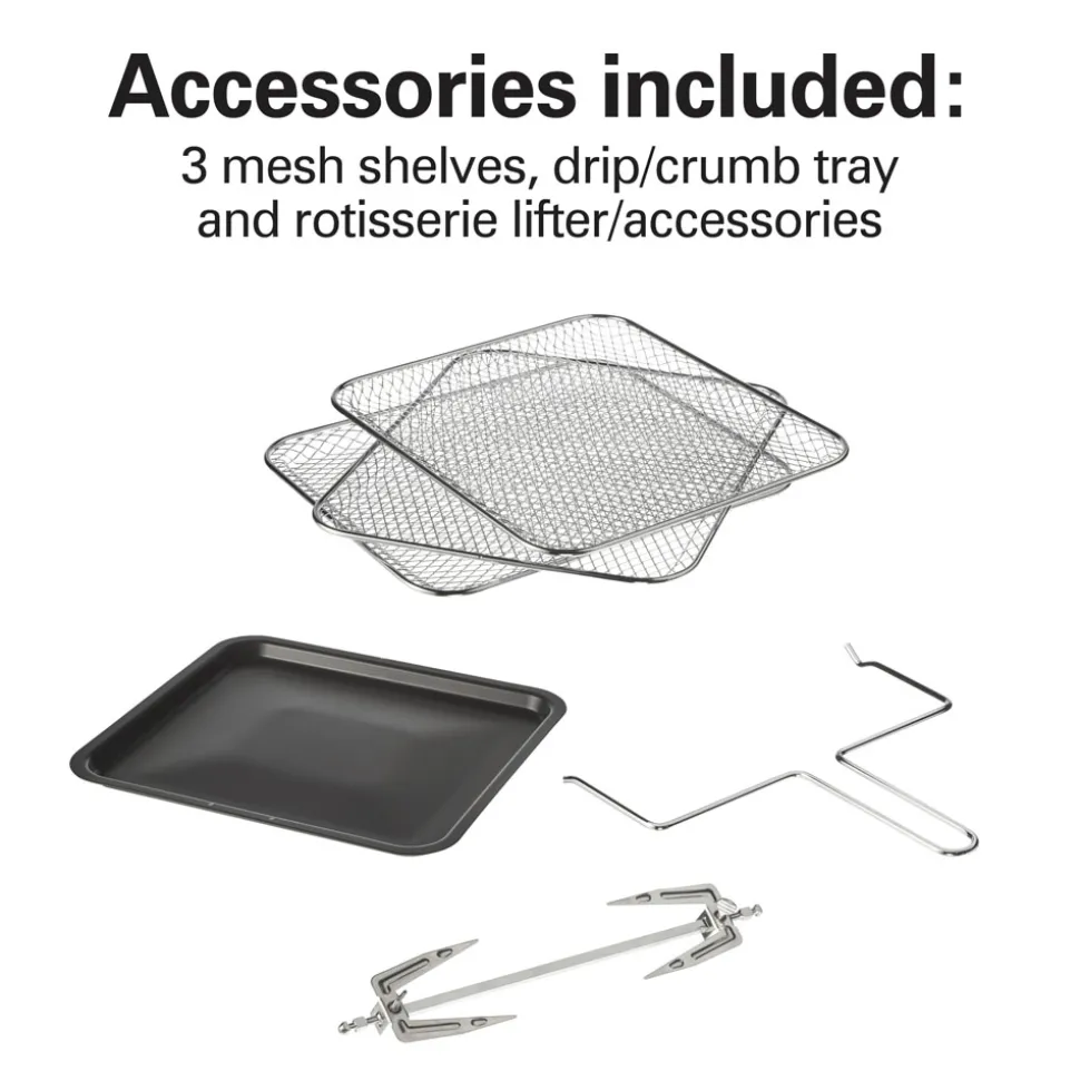 Includes 3 mesh shelves, drip/ crumb tray and rotisserie lifter/ accessories