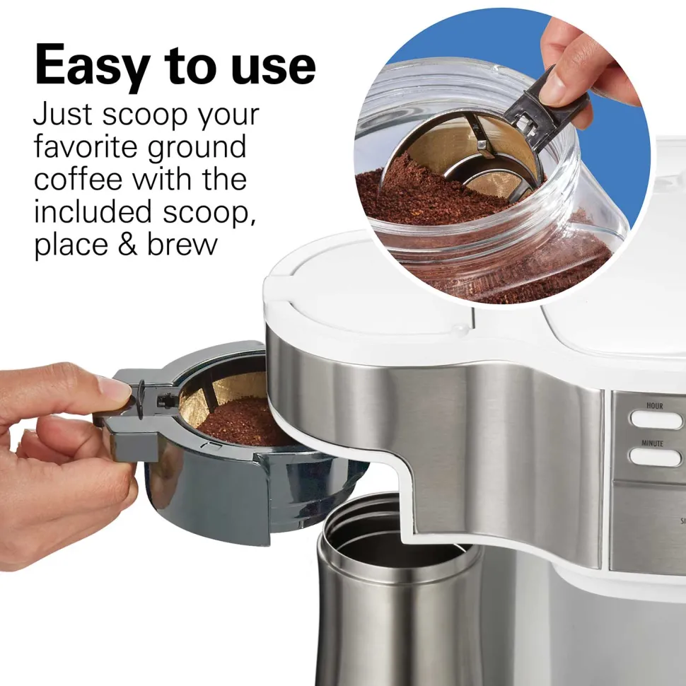 Why waste money on pods that limit your options? Use your favorite ground coffee instead with the Hamilton Beach coffee maker. Note: travel mug and cups are not included.