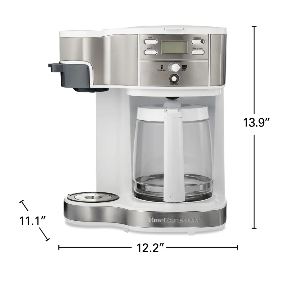 Now there’s a better way to cover the brewing needs of everyone in the household: Hamilton Beach® 2-Way Programmable Coffee Maker. This combo coffee maker lets you brew up to 14 oz. into a cup or travel mug with your favorite ground coffee: just scoop, place and brew. When you want a full pot, the carafe side brews up to 12 cups and gives you the option to program your coffee in advance for wake-up ready coffee. The full-pot carafe side also includes AutoPause & Pour and 2-hour automatic shutoff. You can choose between regular or bold brew strength with Select-a-Brew on both sides and both feature an easy-fill water reservoir with separate windows so there’s never any confusion. The Hamilton Beach 2-Way Programmable Coffee Maker includes a 12 cup capacity glass carafe and single-serve scoop to measure and fill coffee easily. Travel mug and cups are not included.