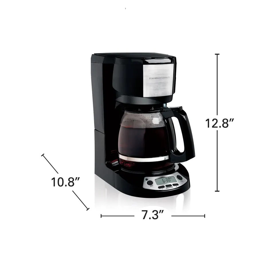 Our 12 Cup Programmable Coffee Maker has convenient features for a flawless cup of coffee, along with great styling and stainless steel accents. Three brewing options provide the flexibility you desire for a convenient cup or pot of coffee. This coffee maker also has a programmable clock and timer allowing you to wake up to freshly brewed great-tasting coffee. The two-hour automatic shutoff ensures that you will not leave your coffee maker on all day. This black coffee maker also comes with a pause-and-serve feature that allows you to pour a cup of coffee from the 12 cup carafe while the coffee is still brewing. It also features a nonstick hot plate, which allows for easy cleaning, a basket-style coffee filter and cord storage.