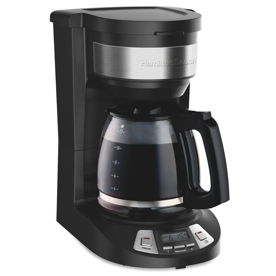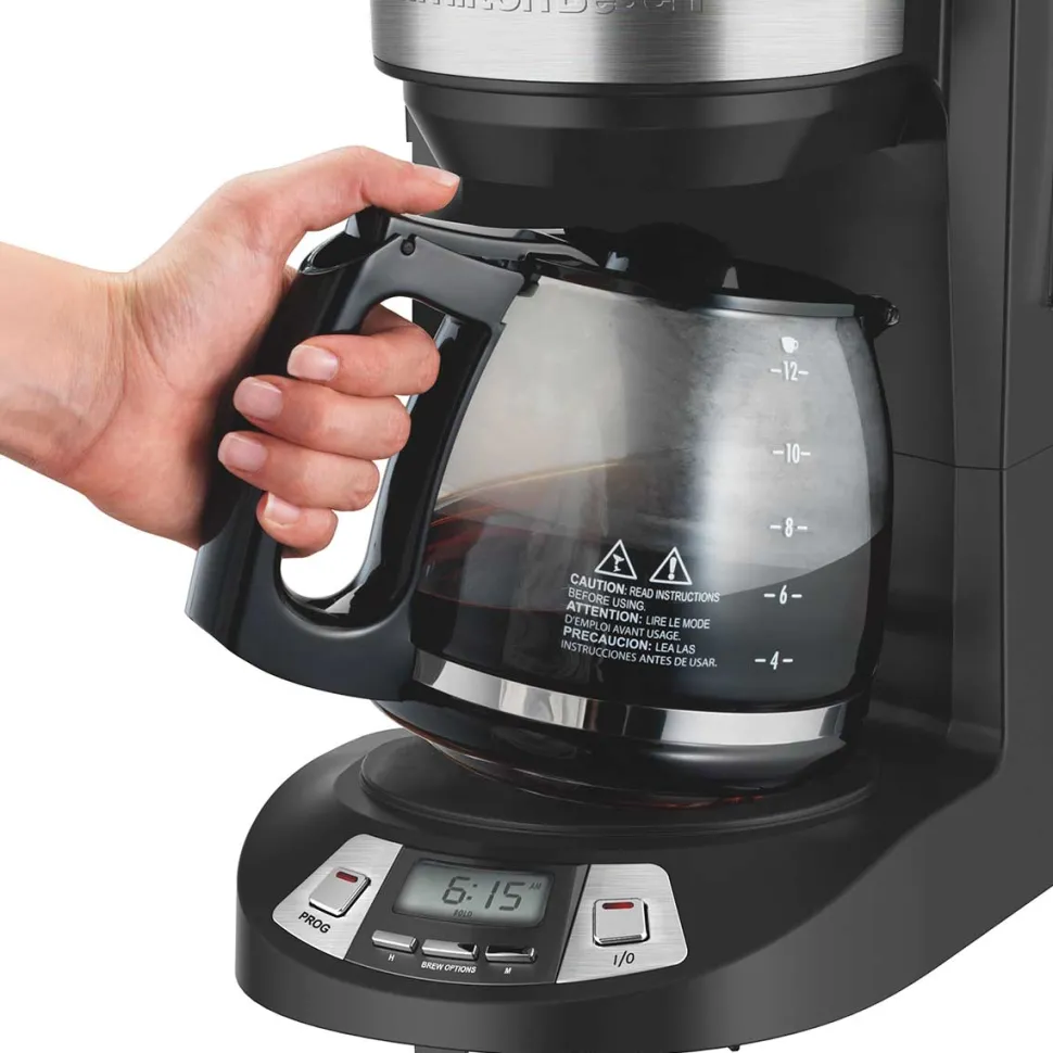 Hamilton Beach Programmable Coffee Maker Skip the alarm and wake up to the aroma of freshly brewed coffee every morning. The Hamilton Beach Programmable Coffee Maker can be programmed up to 24 hours in advance, so you can make sure you never miss your coffee wake-up call. Prefer a robust brew? Or just want the right balance even when you’re making one serving? This coffee maker offers you the brewing customization you need – choose from bold, regular and 1-4 cups. You can pour your first cup before the brewing process is done, without compromising taste or creating a mess, with the auto pause and serve feature. The 2-hour automatic shutoff, you gives you peace of mind. Cord storage eliminates tangles on the countertop.