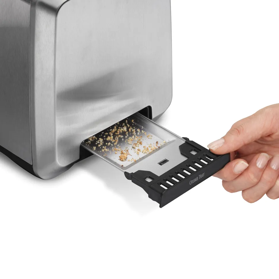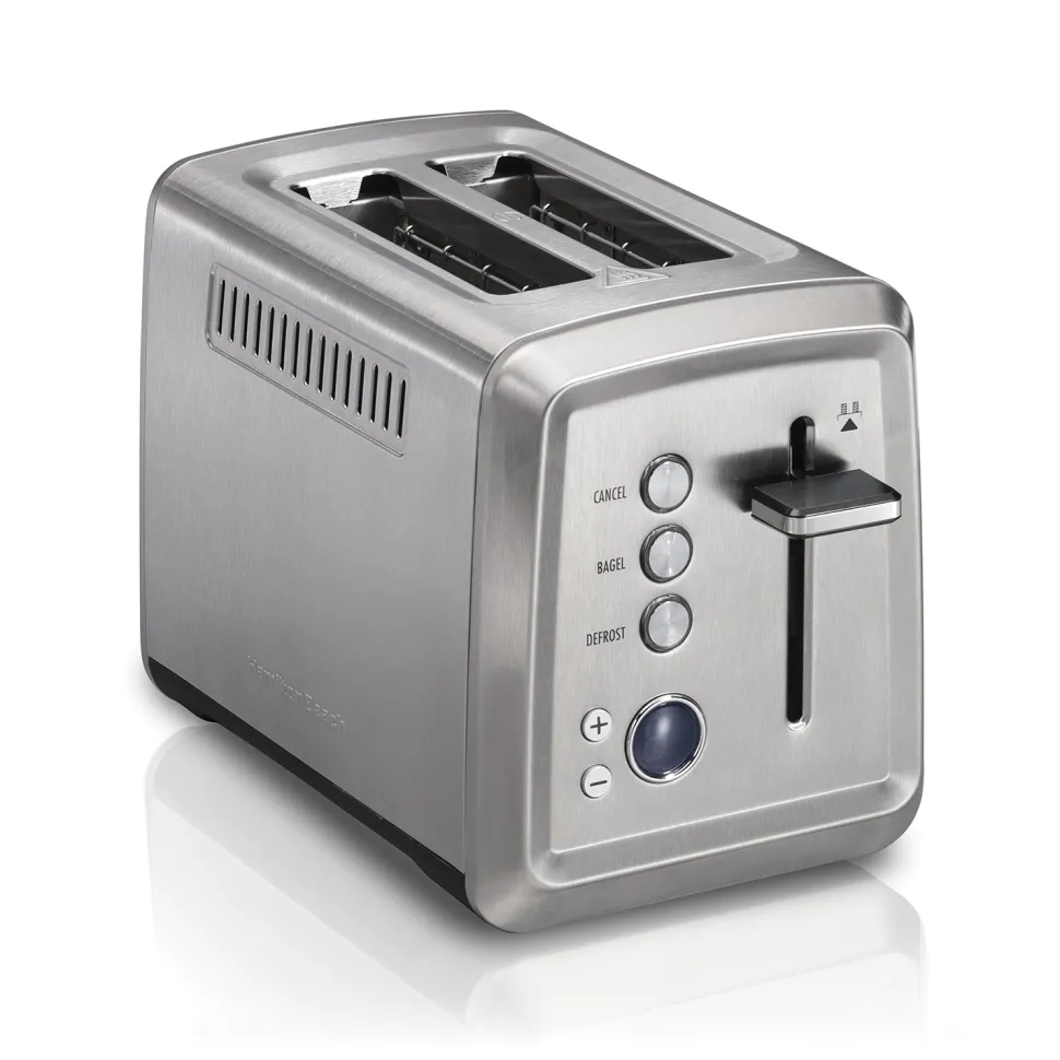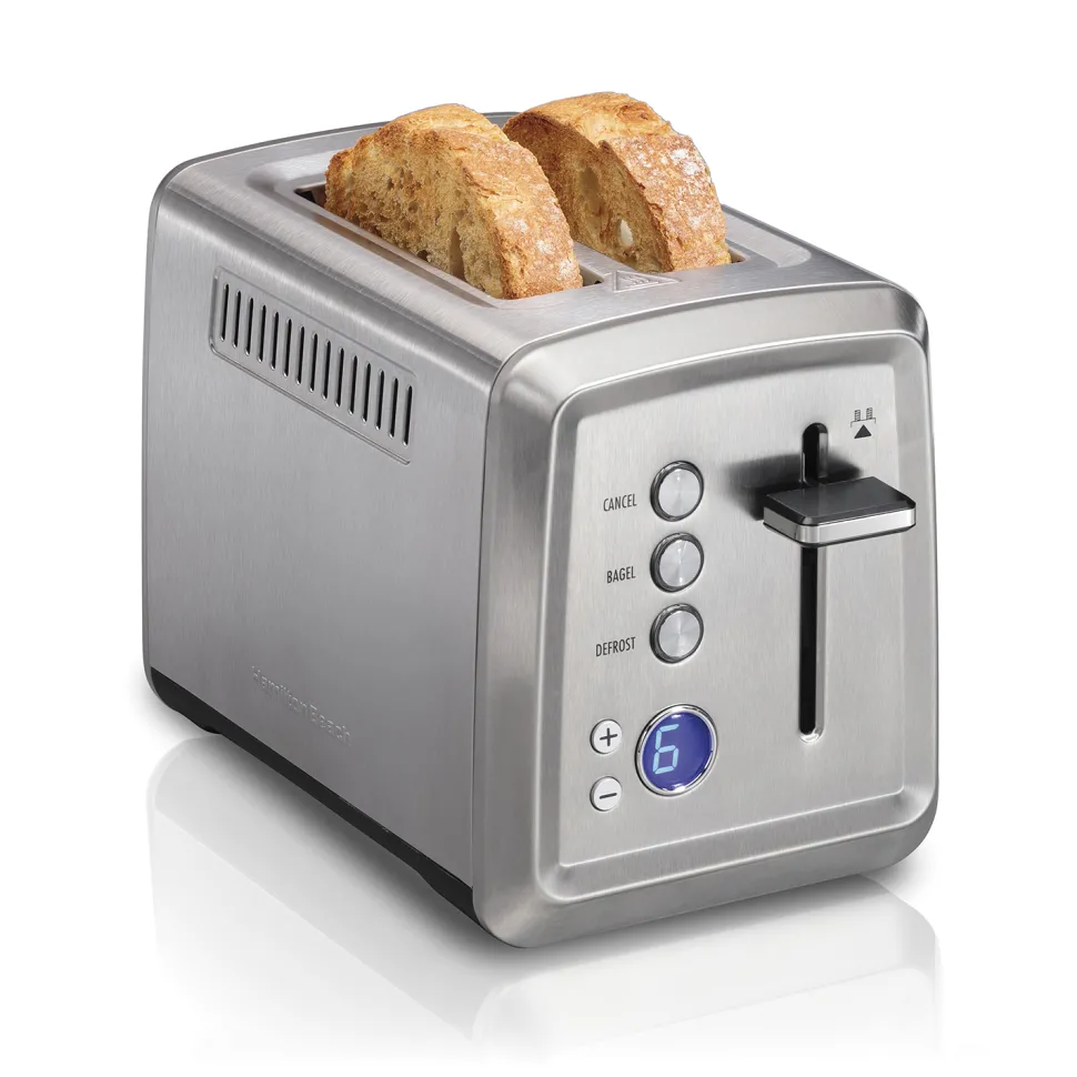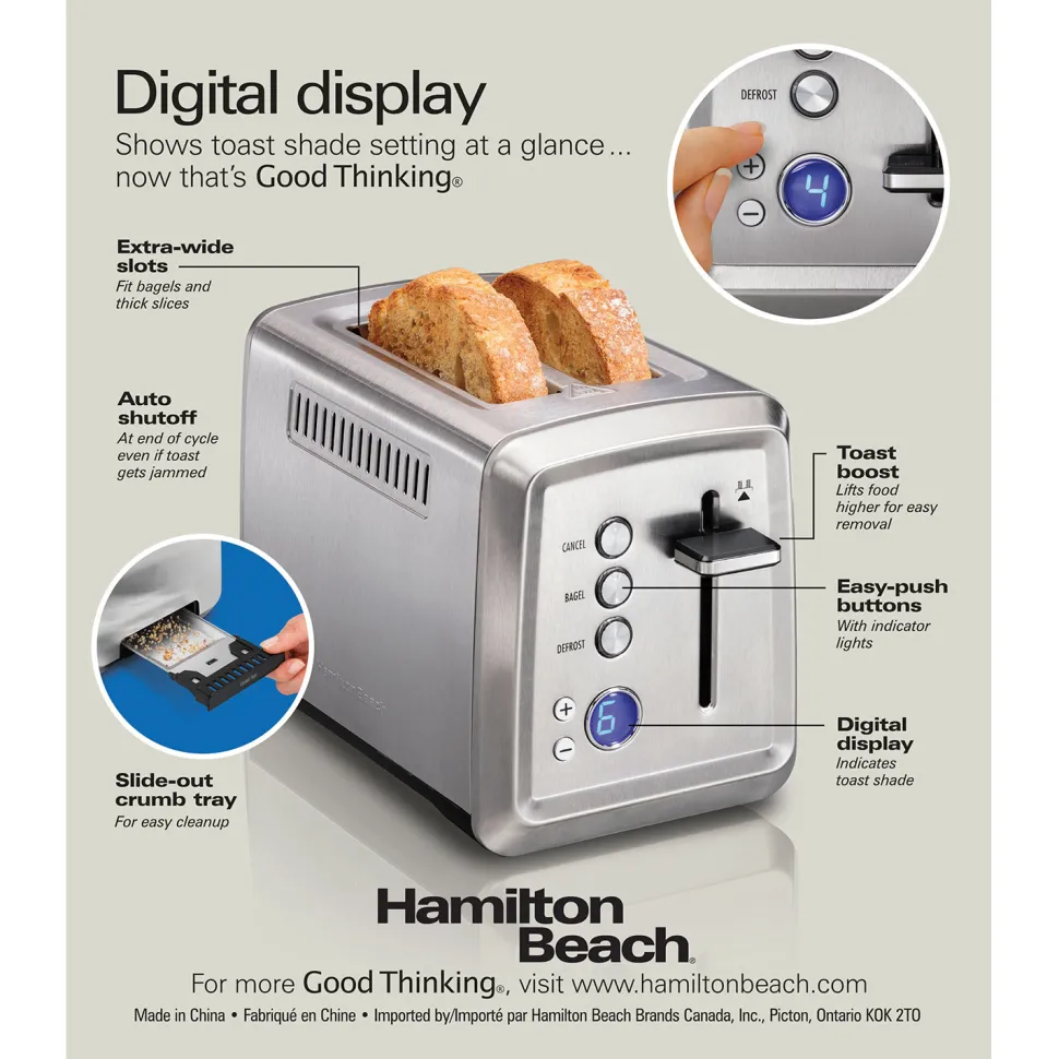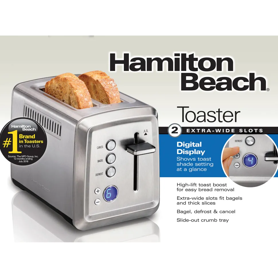 With the Hamilton Beach® Toaster, toasting slices of bread is only the half of it. Two extra-wide slots and a special bagel setting lets you toast the cut side of a bagel while warming the outside. Bring frozen waffles or pancakes to a warm, golden finish with the defrost button, which thaws and then toasts the food. And for smaller items, like English muffins, a toast boost feature gives breads a high lift for easy removal. The modern stainless steel design features a digital display that shows the selected shade at a glance, and easy-push buttons are highlighted with indicator lights. The slide-out crumb tray makes cleaning easy.”>With the Hamilton Beach® Toaster, toasting slices of bread is only the half of it. Two extra-wide slots and a special bagel setting lets you toast the cut side of a bagel while warming the outside. Bring frozen waffles or pancakes to a warm, golden finish with the defrost button, which thaws and then toasts the food. And for smaller items, like English muffins, a toast boost feature gives breads a high lift for easy removal. The modern stainless steel design features a digital display that shows the selected shade at a glance, and easy-push buttons are highlighted with indicator lights. The slide-out crumb tray makes cleaning easy.