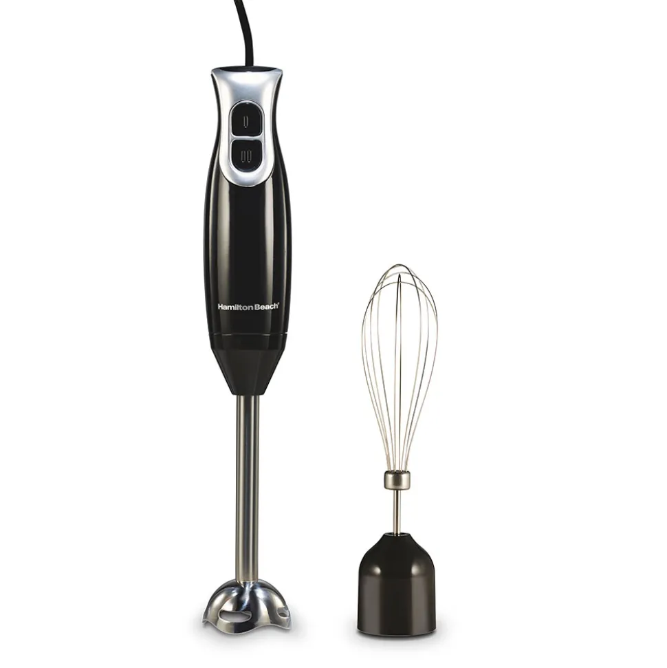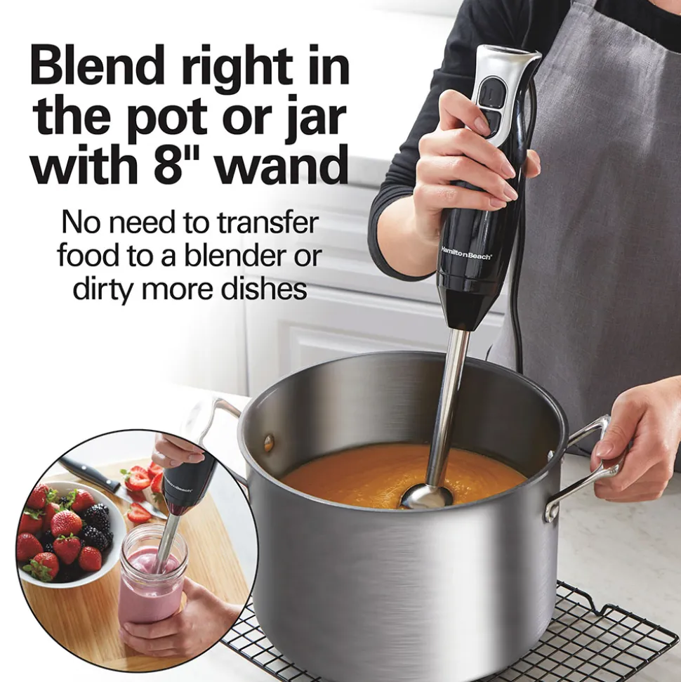 Conveniently blend, mix, puree and whip with the Hamilton Beach® 2 Speed Hand Blender. This one versatile, multifunctional tool is a must-have in every kitchen, whether you’re making soups, sauces and dips, pureeing vegetables, blending smoothies and milkshakes, or whipping cream. There’s no need to transfer ingredients to the blender or dirty extra dishes. This immersion blender lets you blend right in your pot, bowl or jar. It’s perfect for pureeing cooked fruits and vegetables, blending ingredients in soups and making homemade baby food in a jar.