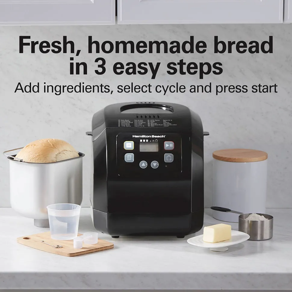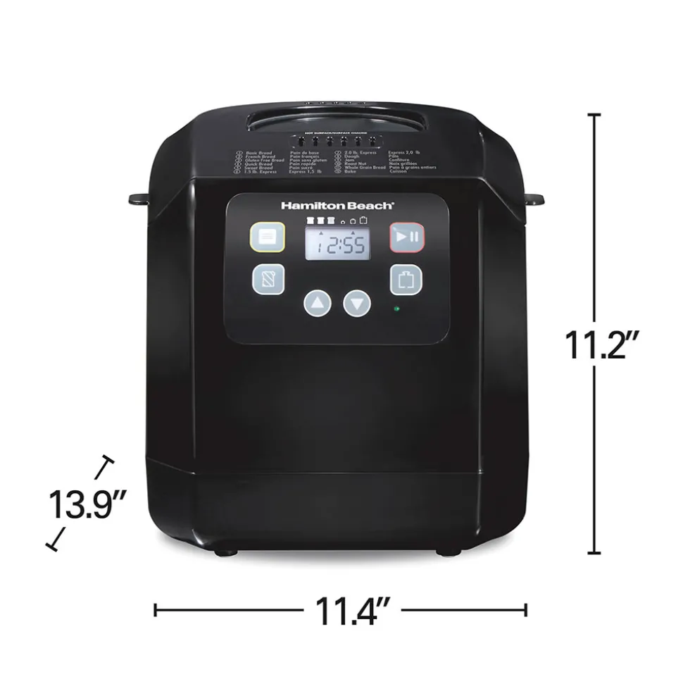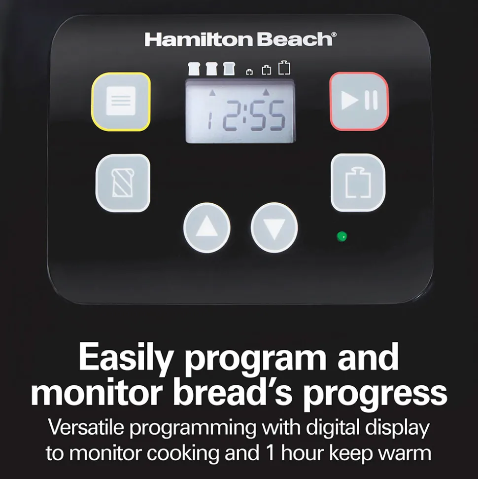 For easy cleanup, the removable nonstick bread pan, kneading paddle, paddle removing tool, measuring cup and spoon are dishwasher safe. The large digital display with countdown timer makes it easy to select your cycle and monitor the time left until bread is ready. It can be set in advance with the delay start cycle and after baking, the Hamilton Beach 2 Lb. Bread Maker automatically keeps bread warm for 1 hour. Recipes included.