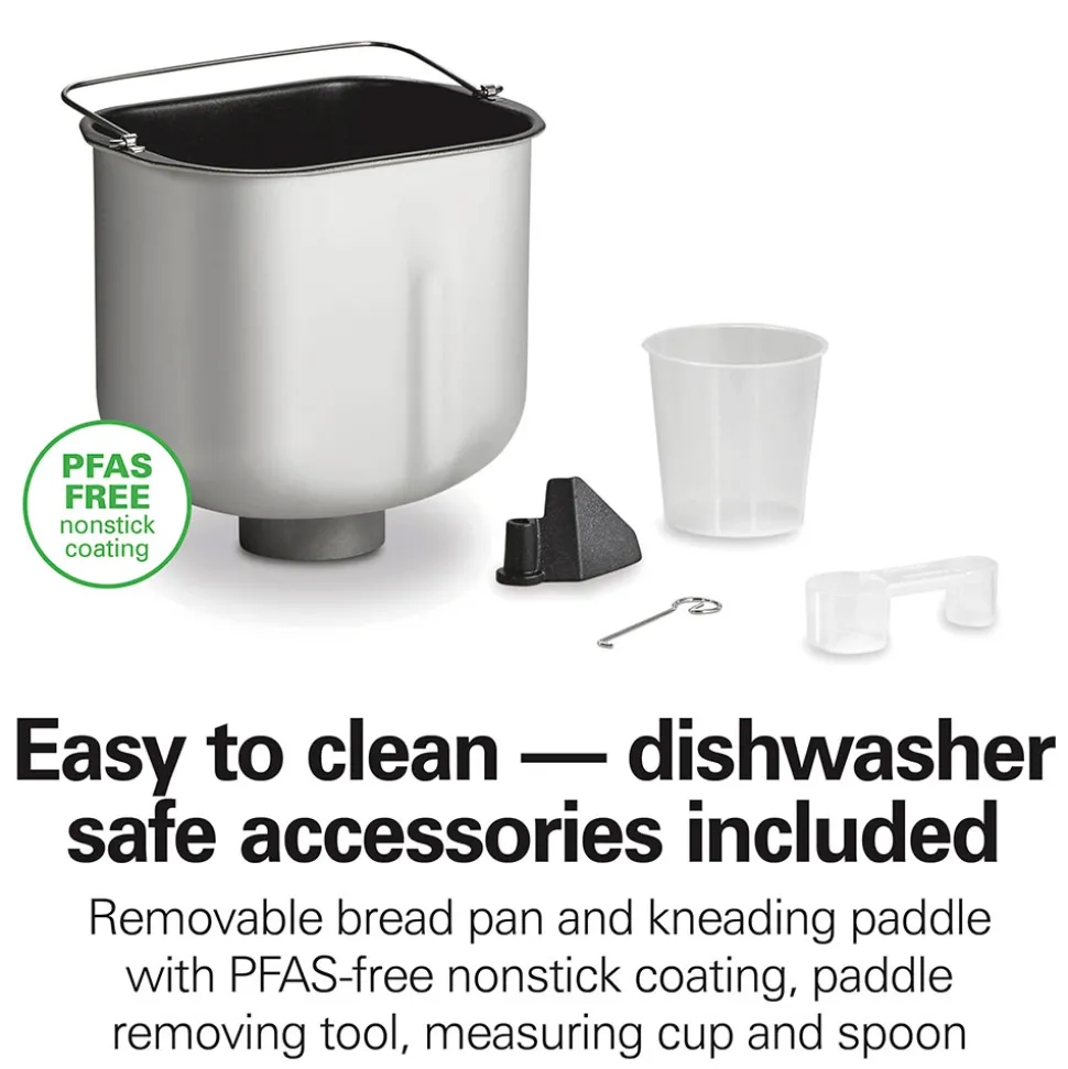 Comes with a removable bread pan and kneading paddle with PFAS-free nonstick coating, paddle removing tool, measuring cup and a spoon for fast, easy cleanup after baking.