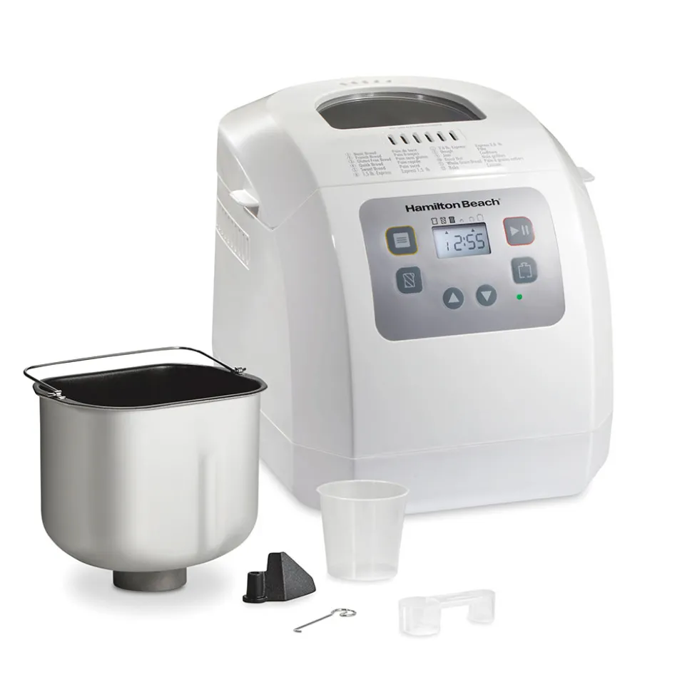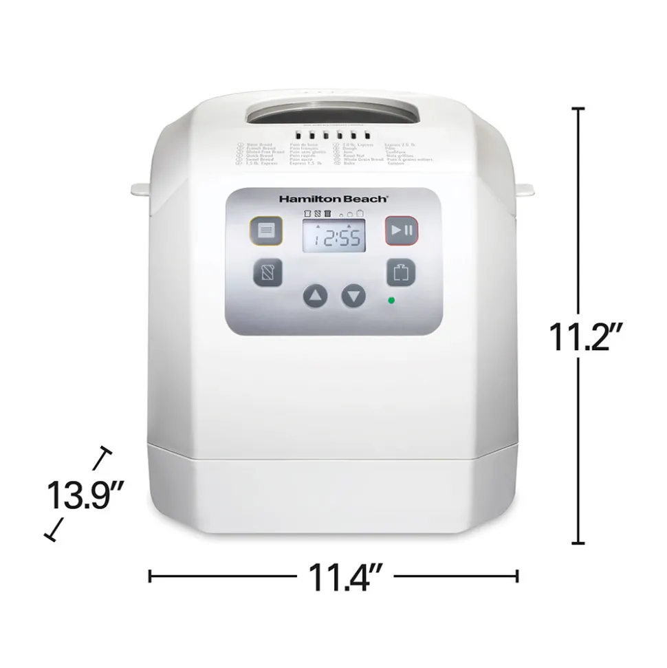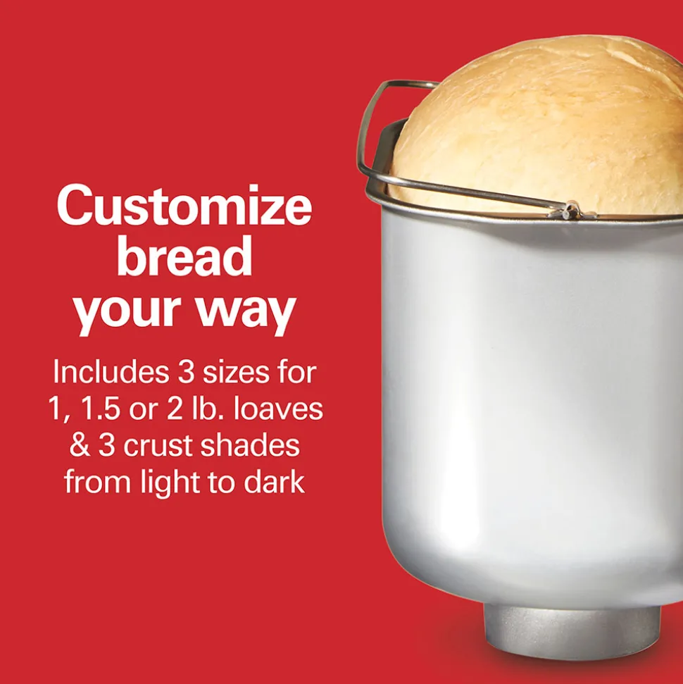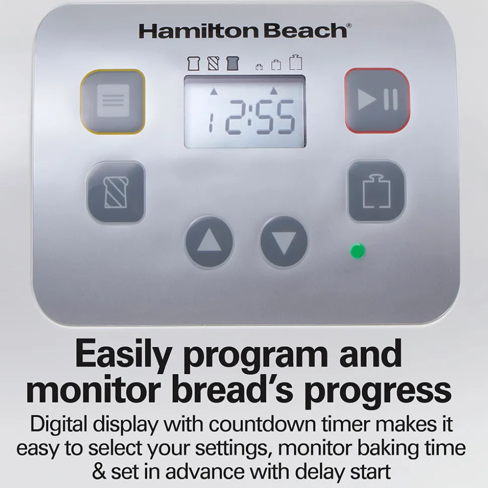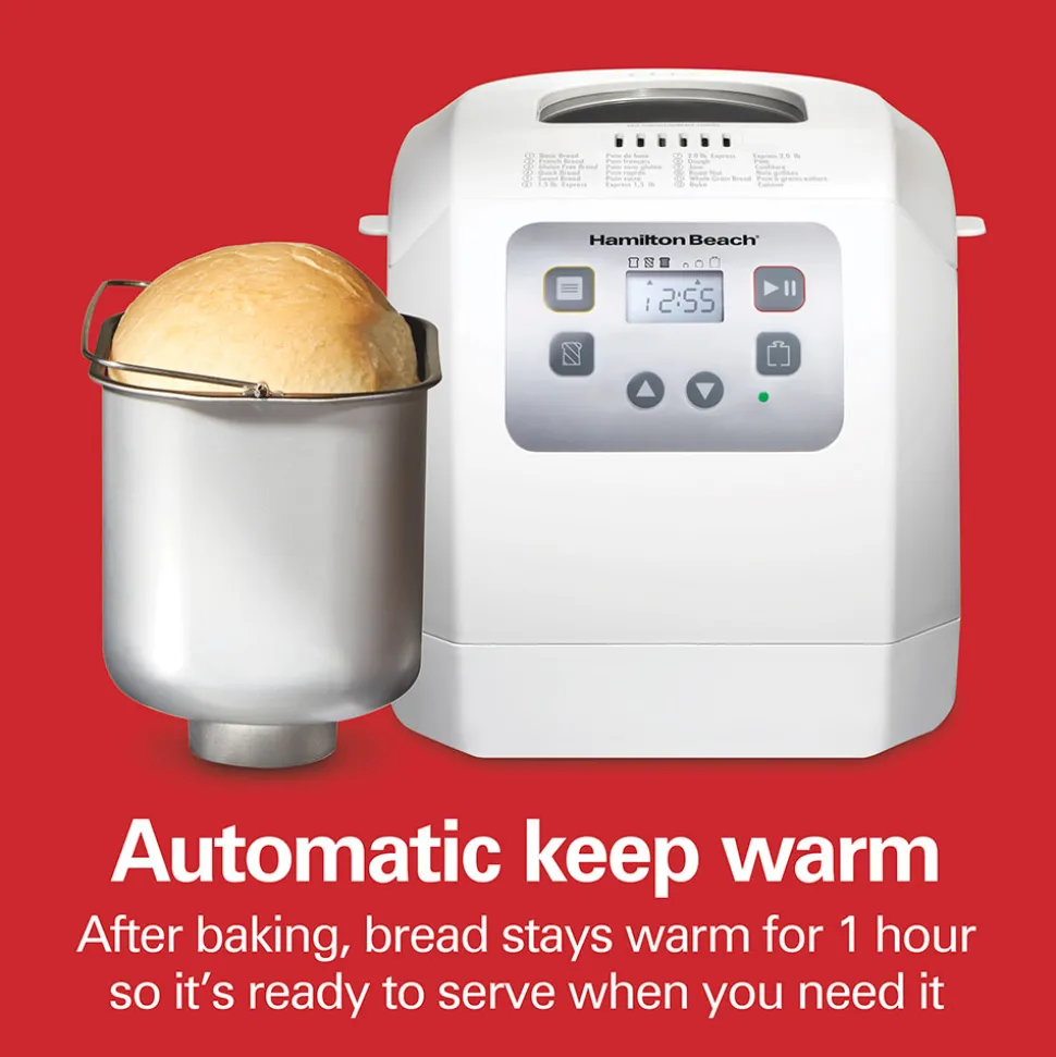 You can customize bread your way with 3 loaf sizes and 3 crust settings for light, medium or dark crust. For easy cleanup, the removable nonstick bread pan, kneading paddle, paddle removing tool, measuring cup and spoon are dishwasher safe. The large digital display with countdown timer makes it easy to select your cycle and monitor the time left until bread is ready. It can be set in advance with the delay start cycle and after baking, the Hamilton Beach 2 Lb. Bread Maker automatically keeps bread warm for 1 hour. Recipes included.