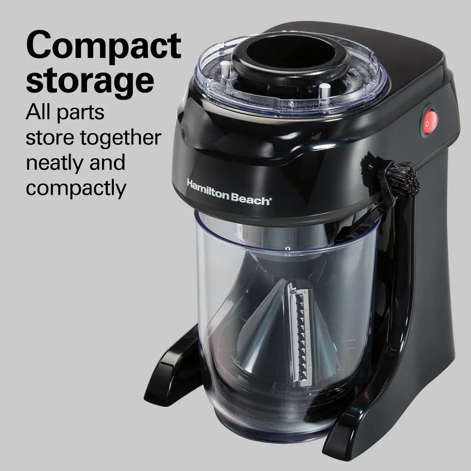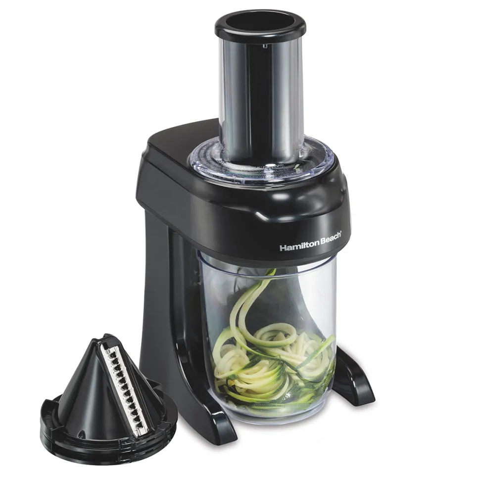The Hamilton Beach® 3-in-1 Electric Spiralizer is perfect for anyone who wants to eat healthy or stick to a low-carb diet. It lets you quickly and easily create healthy vegetable spirals and ribbons to use in your favorite pasta dishes, salads, and other recipes. The spiralizer has 3 cutting cones to transform whole fruits and vegetables into spaghetti, linguine or ribbon-shaped noodles for fun, delicious meals. It’s great for zucchini noodles or “zoodles,” vegetable salad, curly fries, apple tarts and more. The spiralizer bowl holds 6 cups of vegetable noodles and is just the right size for making family meals or processing vegetables for recipes. The large 2.5″ round chute fits whole foods like zucchini, squash and cucumbers, eliminating prep work to save you time and effort in the kitchen. The metal food grip on the food pusher securely holds foods to make beautiful spirals. Simply switch the motor on and gently push food through while the spiralizer does the work for you. The electric spiralizer is easy to clean with dishwasher safe parts and includes a cleaning brush. All parts store together neatly and compactly.