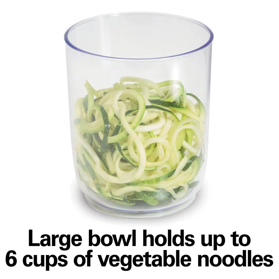 The large bowl on the veggie noodle spiralizer is just the right size for making family meals and for recipes. It holds up to 6 cups of vegetable noodles.