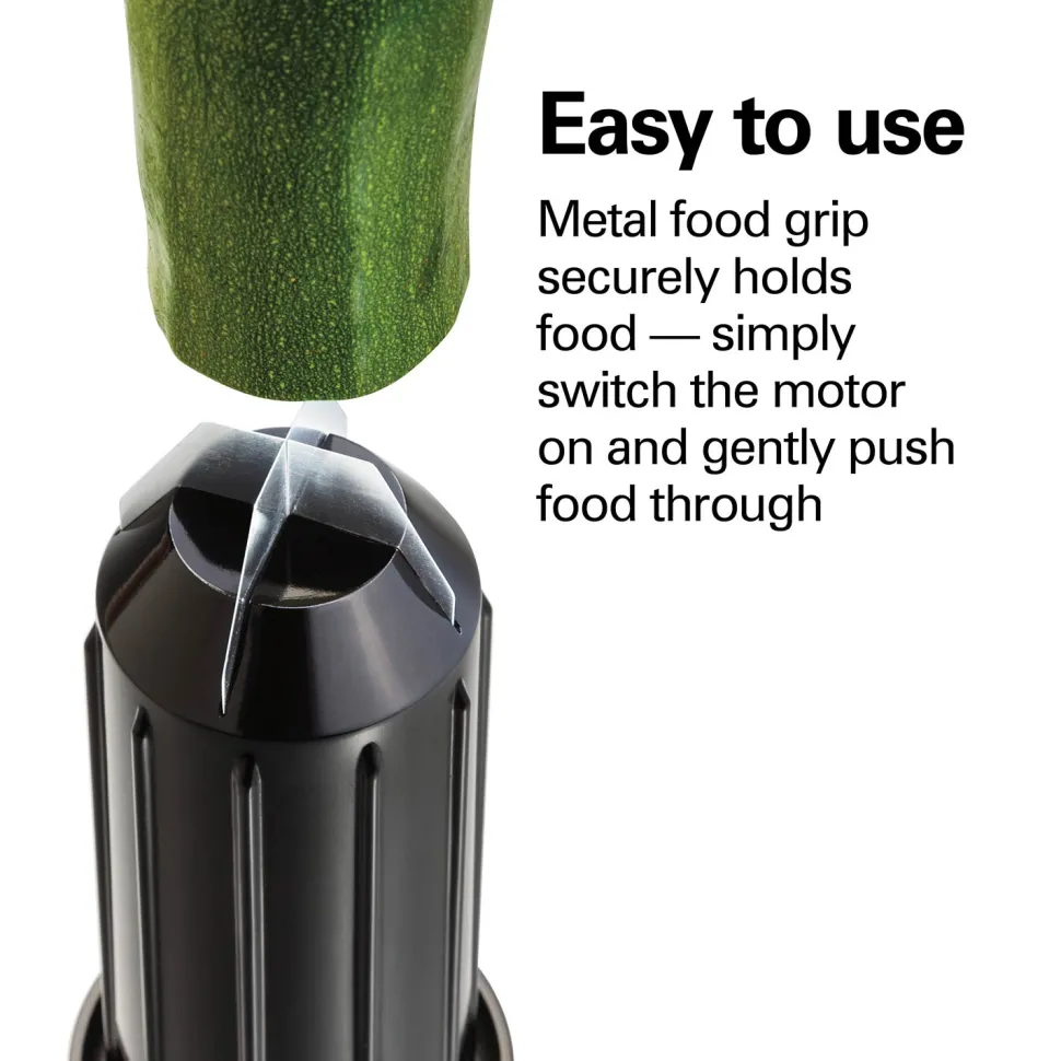 The metal food grip on the food pusher securely holds foods to make beautiful spirals. Simply switch the motor on and gently push food through while the noodle maker does the work for you. No hand-cranking required.
