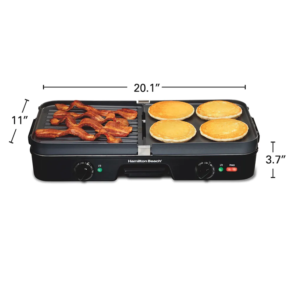 The Hamilton Beach® 3-in-1 Grill/Griddle has two reversible cooking plates that are griddle-smooth on one side and ridged for grilling on the other. It gives you the versatility to cook 3 ways. Just flip and combine the plates to make a full grill, full griddle or a half grill and half griddle at the same time. This flexible grill/griddle combo is great for cooking any meal. Cook a full breakfast of pancakes, sausage and eggs on the griddle, grill burgers for lunch while toasting buns on the griddle side, or grill steak and vegetables for a low-carb dinner. The grill has plenty of power with 1400 watts and two separate cooking zones, each with its own independent controls. Just turn a dial to adjust the temperature up to 425°F. With 180 sq. in. of nonstick cooking surface, this grill/griddle is large enough to cook complete family meals, but gives you option to cook on just one side for smaller meals. The removable PFAS-free ceramic cooking plates are dishwasher safe, and the drip tray goes in the top rack for easy cleanup. The double-sided cooking plates are easy to flip and to snap in and out of place.