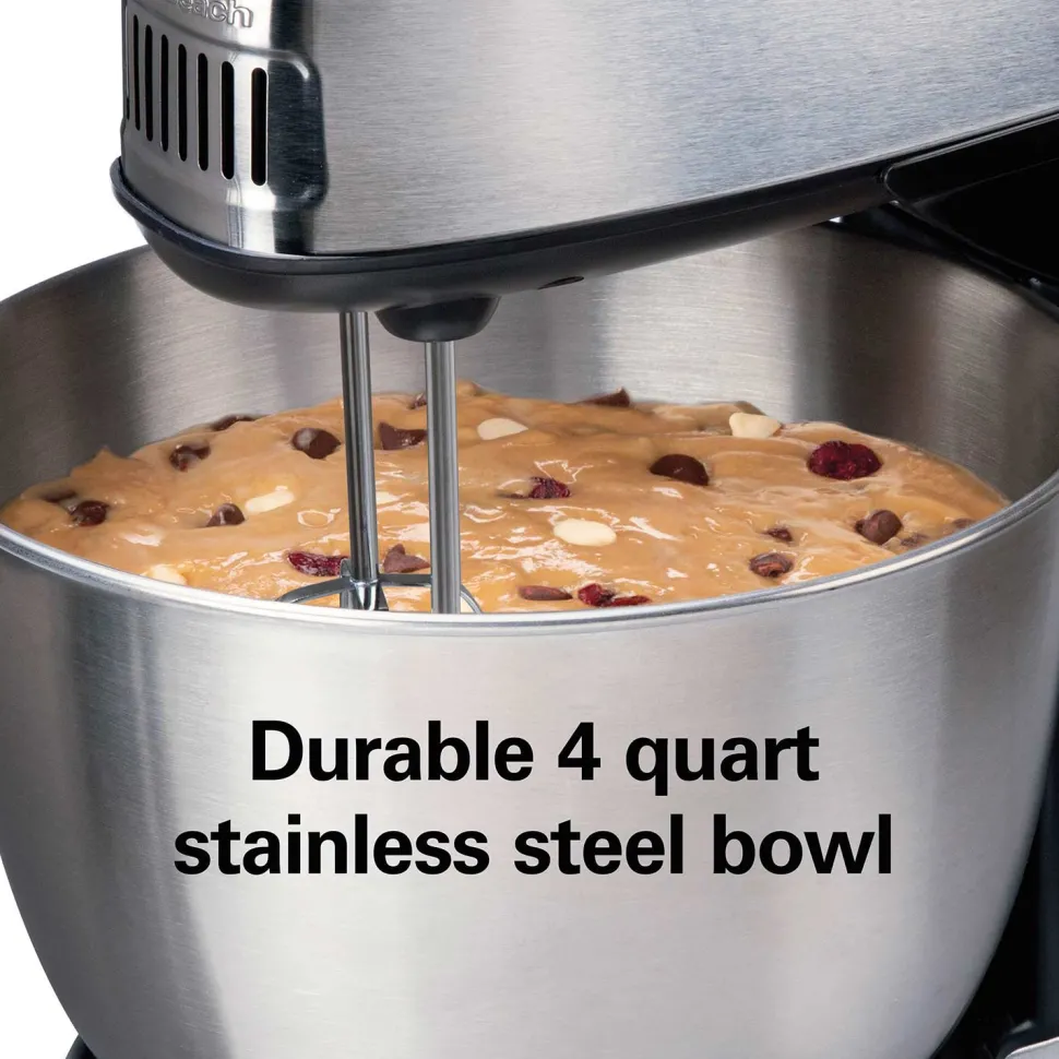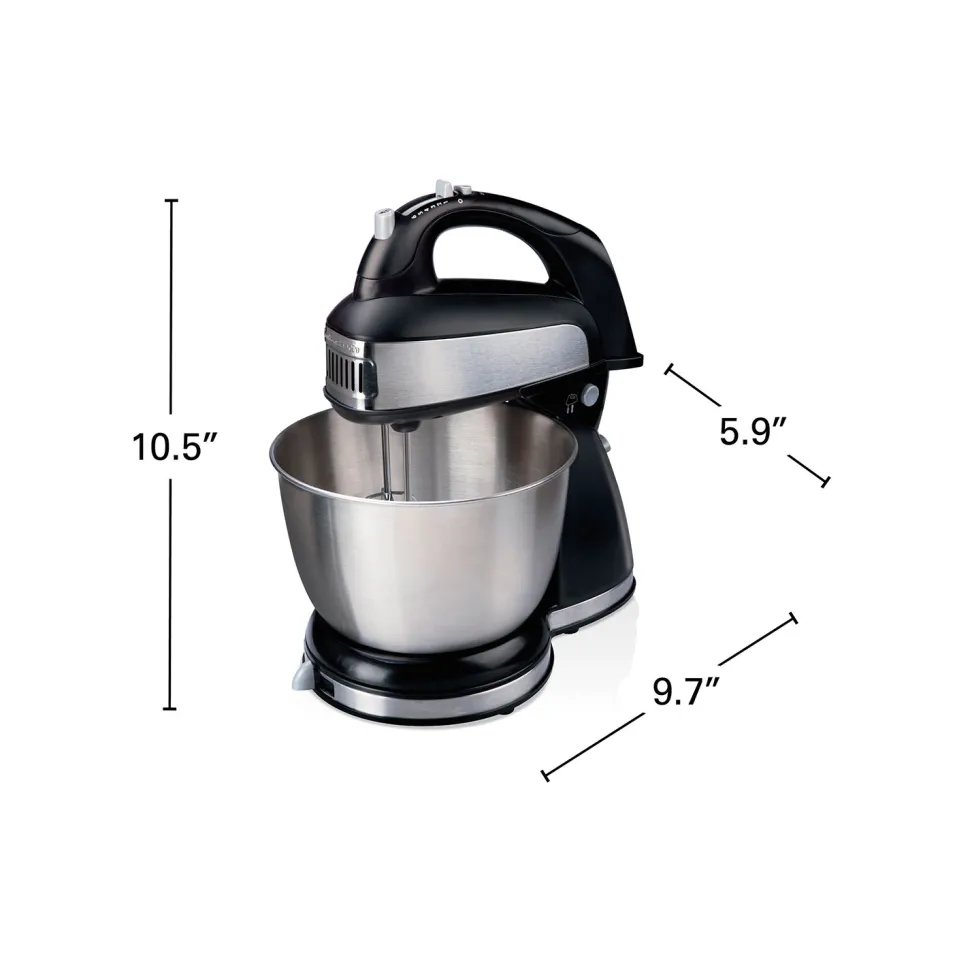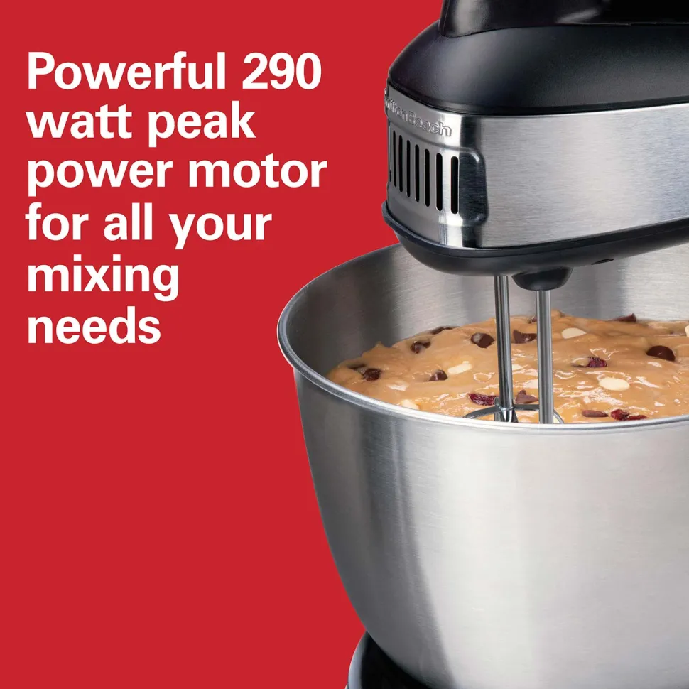 With the Hamilton Beach® Stainless & Black 6 Speed Stand Mixer, you get two products in one space-saving appliance. Mixing a batch of bread or cookie dough? Let the stand mixer do the work. Whipping up a quick dressing? Unlock the hand mixer from the base for the fast results you want. The Hamilton Beach Stainless & Black 6 Speed Stand Mixer has a powerful 290 watt peak power motor for all your mixing needs. As you mix, the Shift & Stir™ bowl rotating lever lets you rotate the bowl from side to side for thorough mixing. The 2 traditional beaters, a whisk and 2 dough hooks take you from mixing cake batter and cookie dough to whipping cream and kneading pizza dough. You can easily handle a wide range of mixing jobs with 6 speeds, and the QuickBurst™ button provides an extra burst of power at any speed. The durable 4 quart (3.8 L) stainless steel bowl easily accommodates most recipes and is dishwasher for easy cleanup. After mixing, the beater eject makes it easy to remove the attachments, which are also dishwasher safe.