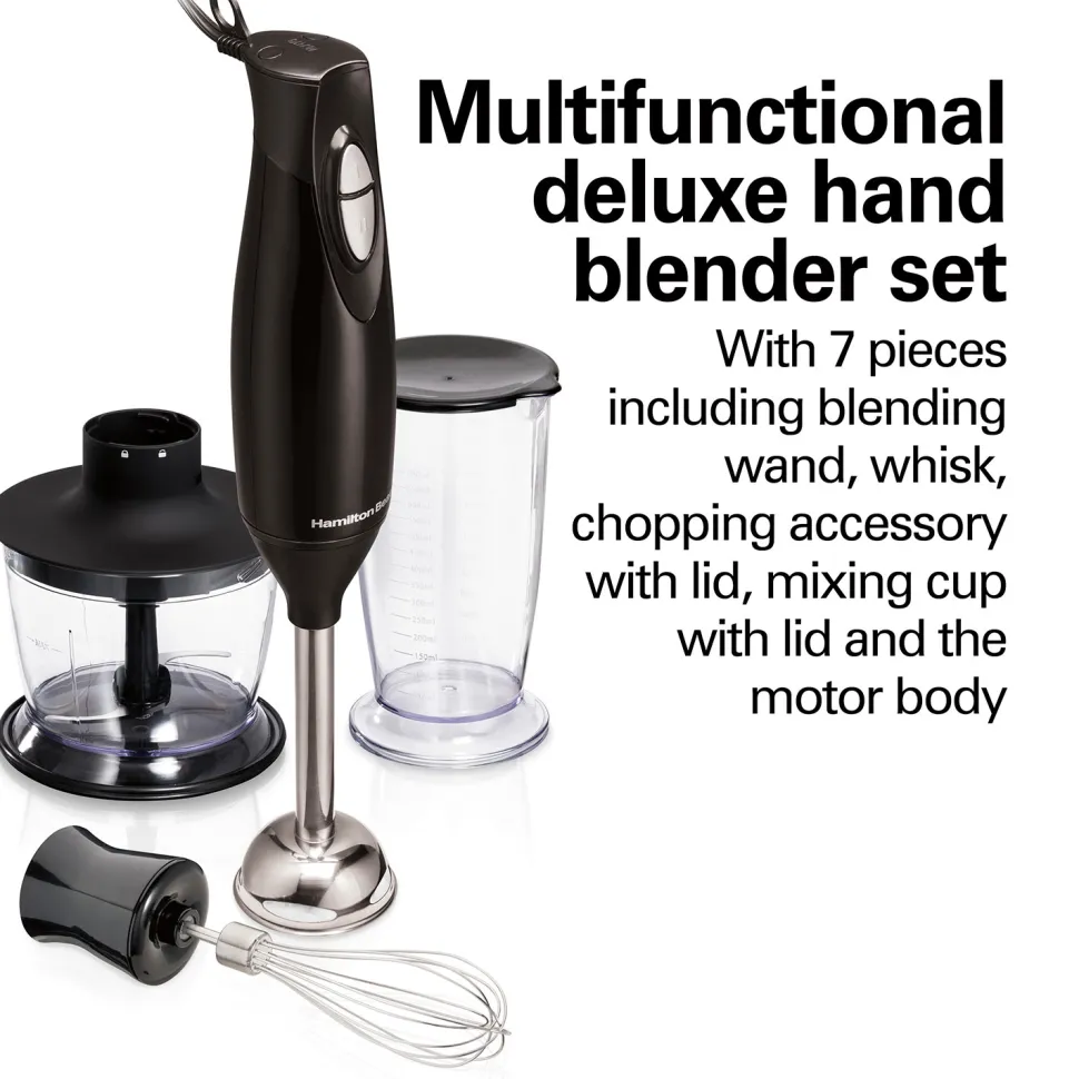 The Hamilton Beach® 7 Piece Hand Blender Set replaces the need for multiple kitchen tools and takes up less space. You’ll reach for it every time you need to prepare a quick salad dressing, chop onions, make soup, puree dips and sauces, scramble eggs or make a batch of whipped cream to top off dessert. This versatile, multifunctional tool has 225 watts of peak power to effortlessly handle a variety of ingredients. It’s perfect for pureeing cooked fruits and vegetables, blending ingredients in soups and making homemade baby food. With an easy-grip design and 2 speeds to choose from, you’ll have more control and flexibility when blending, pureeing, mixing, whipping and chopping. Even better, there’s no need to dirty extra dishes — just blend right in your pot, pan, bowl or jar. This versatile 7 piece set includes a blending wand, whisk, chopping accessory with lid, mixing cup with lid and motor body with power cord. For easy cleanup, all removable parts are dishwasher safe.