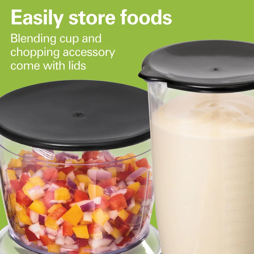 - Easily store foods — the blending cup and chopping accessory come with lids