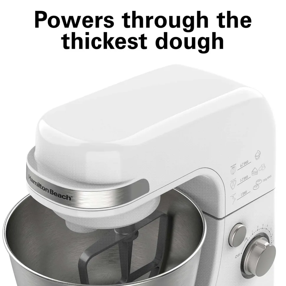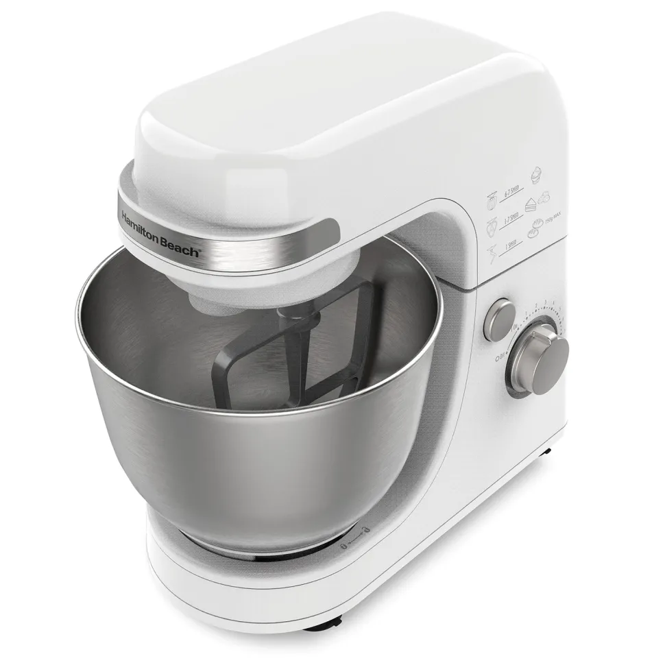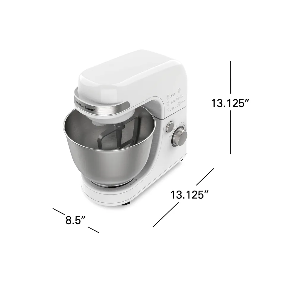 The Hamilton Beach® Stand Mixer easily mixes everything from cookie and bread dough to cake batter and whipped cream. It has the same planetary mixing action as the higher-priced brands and provides complete bowl coverage for thorough, hands-free mixing. It’s built with a 300 watt motor that powers through the thickest dough and is able to maintain constant speed no matter what you’re mixing. The Hamilton Beach Stand Mixer comes with 3 attachments for mixing versatility including a dough hook, whisk & flat beater and its 7 mixing speeds take you from slowly folding ingredients on the first speed all the way up to whipping at top speed. The durable stainless steel 4 qt. bowl withstands year after year of mixing and comes with a removable splatter shield. Whenever you need to add more ingredients to the bowl or change attachments, the tilt-up head is easily moved up and out of your way.