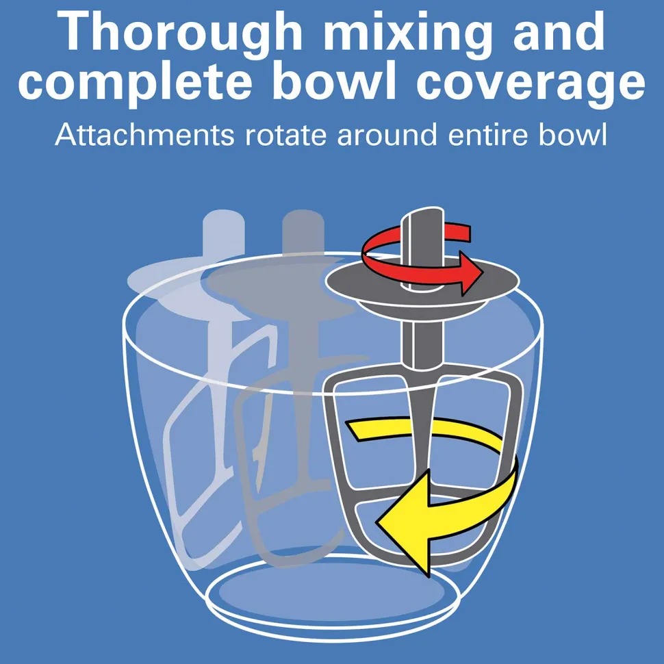 As you mix, each attachment rotates around the entire bowl as it spins at your selected speed. This planetary mixing action ensures that all ingredients are mixed thoroughly and provides complete bowl coverage. You’ll get the same mixing action used by the higher-priced brands.