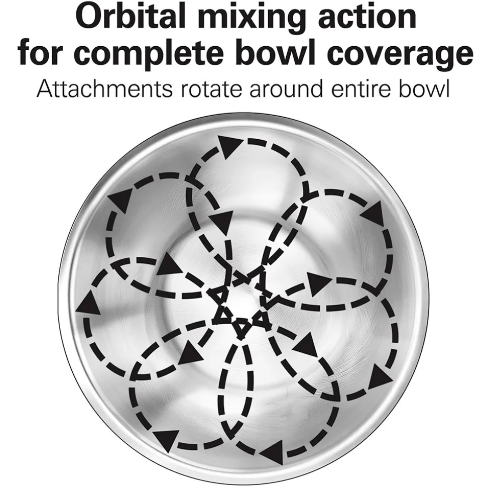 The electric mixer has the same orbital mixing action as the higher-priced brands. The attachments rotate around the entire bowl.