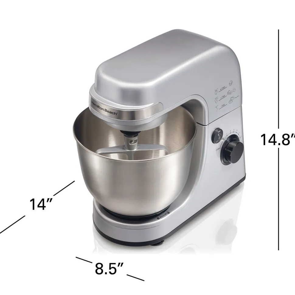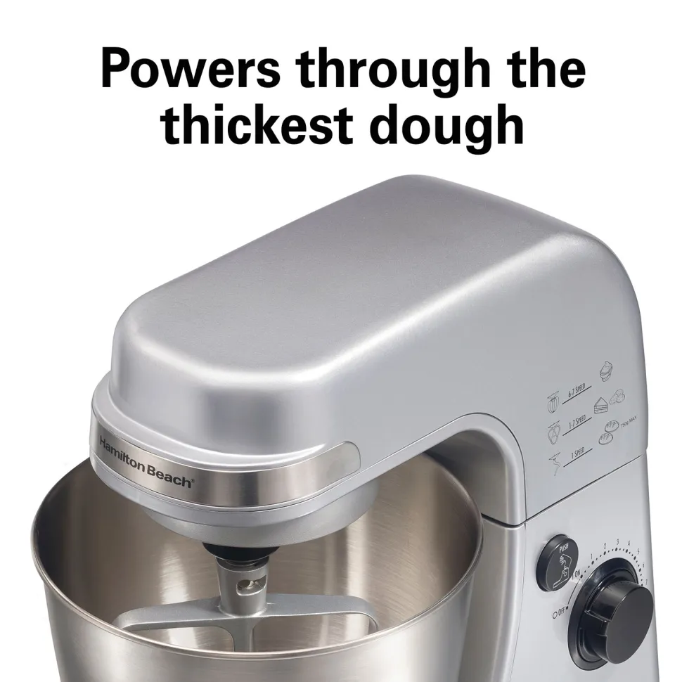The Hamilton Beach® Stand Mixer easily mixes everything from cookie and bread dough to cake batter and whipped cream. It has the same planetary mixing action as the higher-priced brands and provides complete bowl coverage for thorough, hands-free mixing. It’s built with a 300 watt motor that powers through the thickest dough and is able to maintain constant speed no matter what you’re mixing. The Hamilton Beach Stand Mixer comes with 3 attachments for mixing versatility including a dough hook, whisk & flat beater and its 7 mixing speeds take you from slowly folding ingredients on the first speed all the way up to whipping at top speed. The durable stainless steel 4 qt. bowl withstands year after year of mixing and comes with a removable splatter shield. Whenever you need to add more ingredients to the bowl or change attachments, the tilt-up head is easily moved up and out of your way.