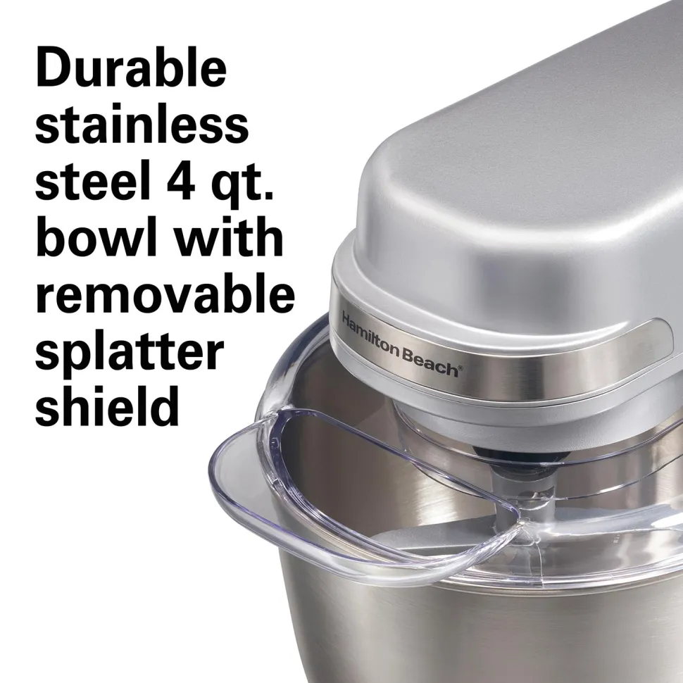 - Durable stainless steel 4 qt. bowl with removable splatter shield