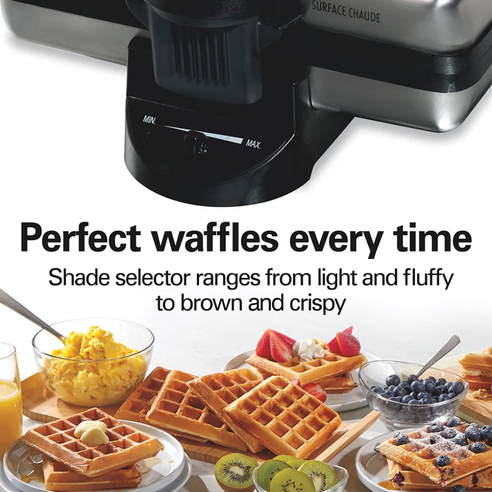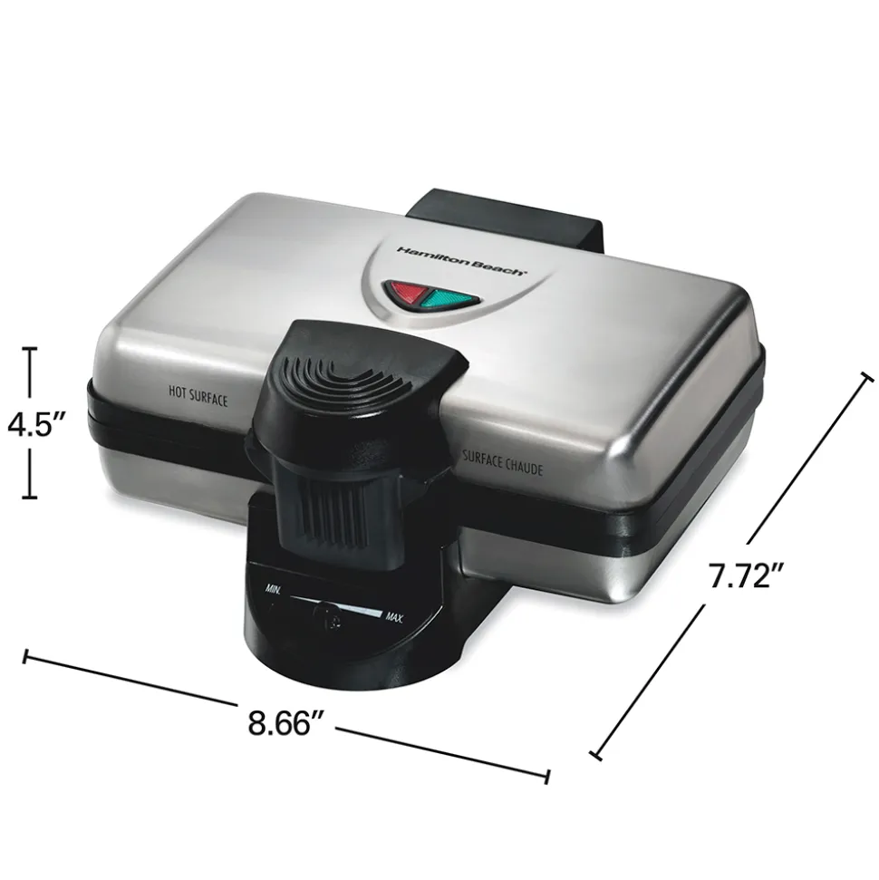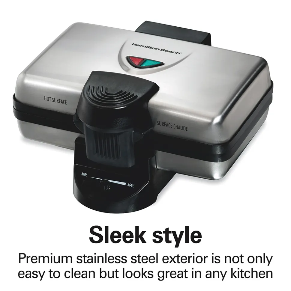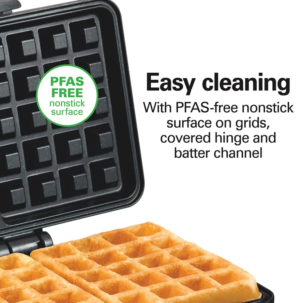 Make your weekends special with hot, tasty waffles made in the Hamilton Beach® Belgian-Style Waffle Maker. Cook crispy, delicious Belgian-style waffles, keto chaffles, hash browns and much more! Compact, upright storage allows the waffle maker to fit easily into the cupboard or pantry. The shade selector allows homemade or store-bought batter to cook light and fluffy or brown and crispy. When finished, the PFAS-free nonstick surface on the grids, covered hinge and batter channel clean with a simple wipe down. Easy-to-see ready light lets you know when the Belgian waffle maker is ready for batter, so there’s no guesswork involved. Get creative with gourmet recipes built from simple ingredients.