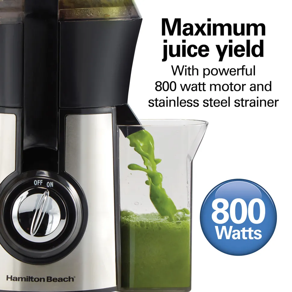 Enjoying fresh, healthy juice has never been easier. With its extra-large 3 inch chute, powerful motor, and simple controls, the Hamilton Beach Big Mouth® Pro 800 Watt Juice Extractor quickly transforms whole fruits and vegetables into nutritious juice in seconds. The powerful motor ensures maximum juice yield for less waste and more flavorful juice, and the simple on/off dial is easy to use. The 3 inch Big Mouth® chute lets you easily add whole foods to save time and effort in the kitchen. Fit whole apples, peeled oranges, or handfuls of kale. The stainless steel micromesh filter strains away pulp and seeds for smooth, nutritious juice every time. The juice extractor comes with recipes and a 16 oz. juice cup so you get started making juice right away with a variety of vegetables and fruit. Juice everything from firm carrots and celery to delicate leafy greens or use the juicer to make soy, almond or rice milk. The juicer is BPA free in food zones, has dishwasher safe parts, and includes a brush for cleaning the stainless steel strainer. This durable juice extractor is backed by Hamilton Beach, America’s #1 juice extractor brand,* with a lengthy 3 year limited warranty.