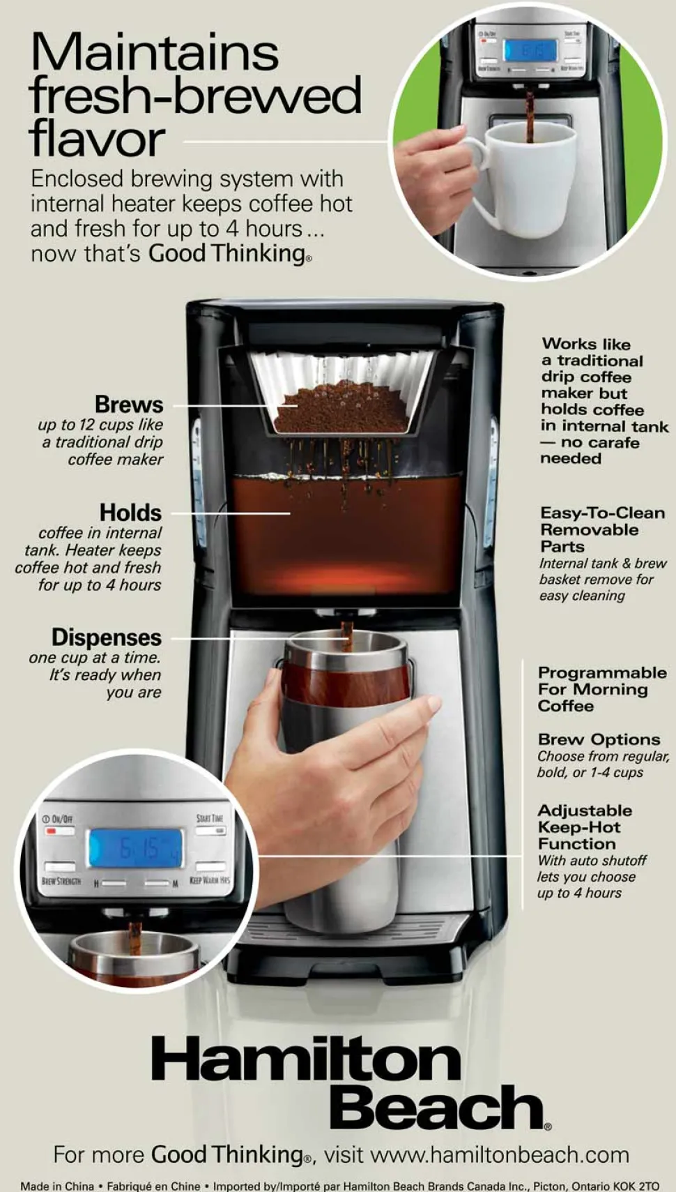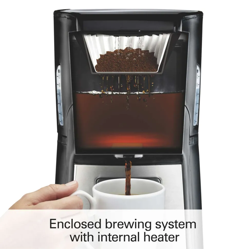 - Works like a traditional drip coffee maker but holds coffee in internal tank — no carafe needed