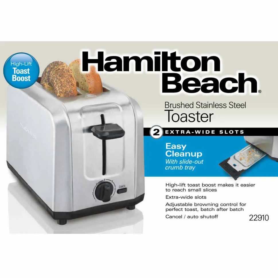 Make perfect toast in the Hamilton Beach® Brushed Stainless Steel Toaster with the added convenience of easy removal. This attractive toaster has a toast boost feature that gives breads a high lift for removal, so you can easily grab even the smallest of slices. Extra wide slots make it ideal for bagels, English muffins or slices of artisan bread. A shade selector lets you achieve your preferred toast doneness. And the automatic shutoff will turn it off at the end of the cycle, even if food gets jammed. Made with a brushed stainless steel finish, this toaster will be a stylish addition to your countertop, but is also easy to store thanks to a fuss-free cord wrap.