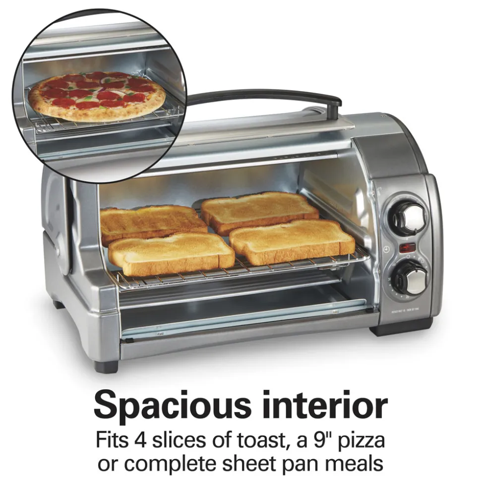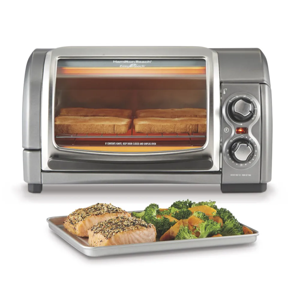 The Hamilton Beach Easy Reach 4-Slice Toaster Oven has a door that rolls up to give you easy access to the oven without blocking your countertop. Because it stays up and out the way of drips and spills, the door doesn’t get as messy as traditional toaster oven doors. The door is also removable for easy cleaning. This toaster oven is the ideal size for everything from snacks and side dishes to complete sheet pan meals, and it fits 4 slices of toast or a 9″ pizza.