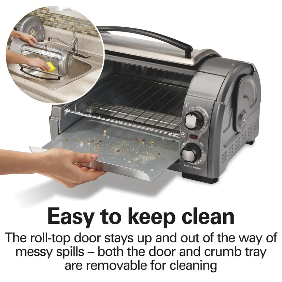The door stays up and out of the way of messy spills and drips when opened. The roll-top door and slide-out crumb tray are both removable for cleaning.