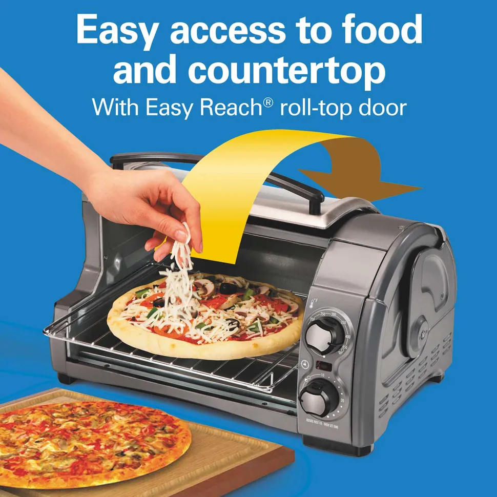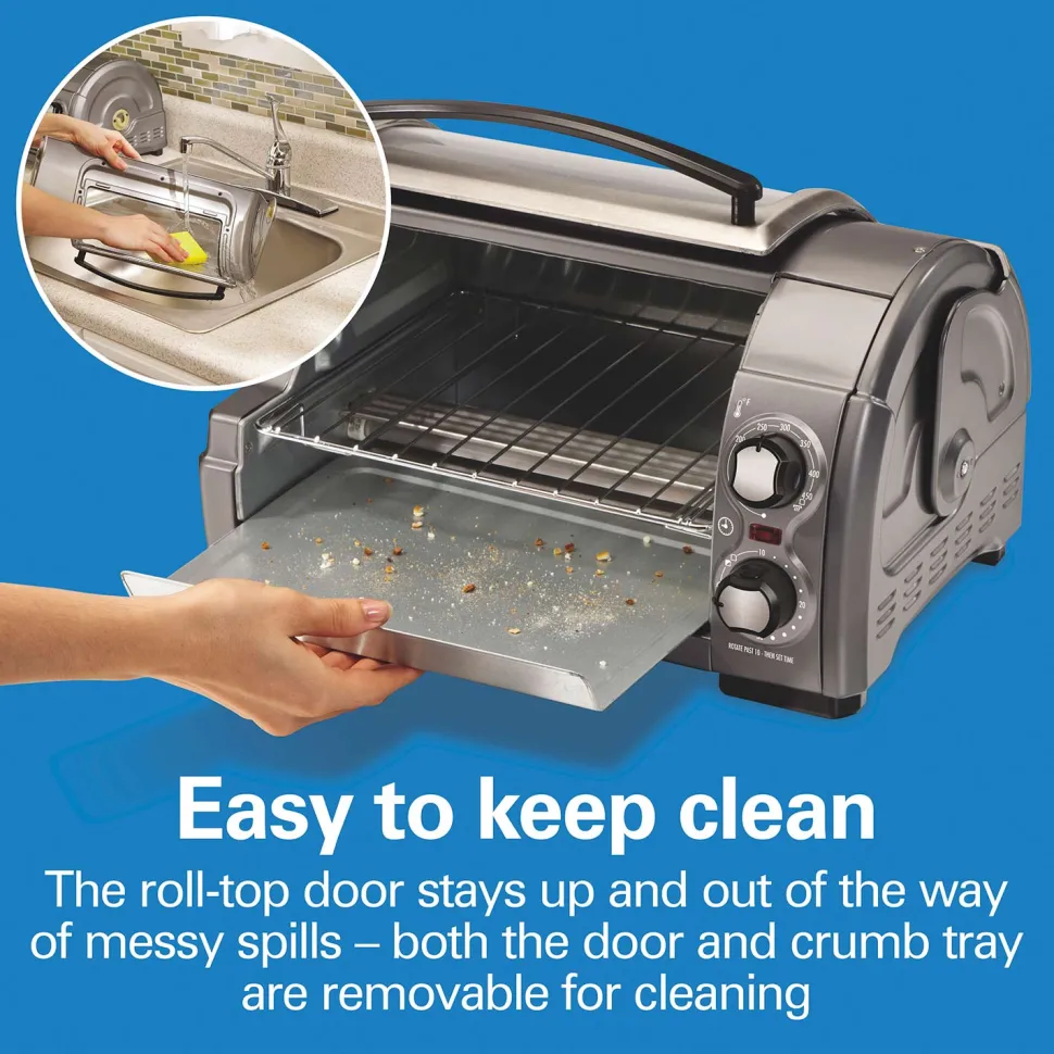 The Hamilton Beach® Easy Reach® Toaster Oven has a door that rolls up and stays out of the way to give you easy access to the oven without blocking your countertop. Because it stays up and out the way of drips and spills, the door doesn’t get as messy as traditional toaster oven doors. The door is also removable for easy cleaning.
