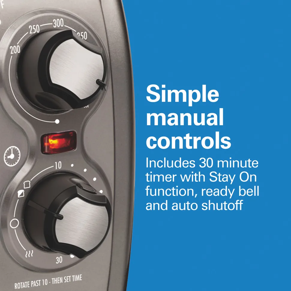 This toaster oven has manual controls that are simple to use. Great for anyone who wants a toaster oven that gets the job done without being complicated. Includes 30 minute timer with Stay On function, ready bell and auto shutoff.