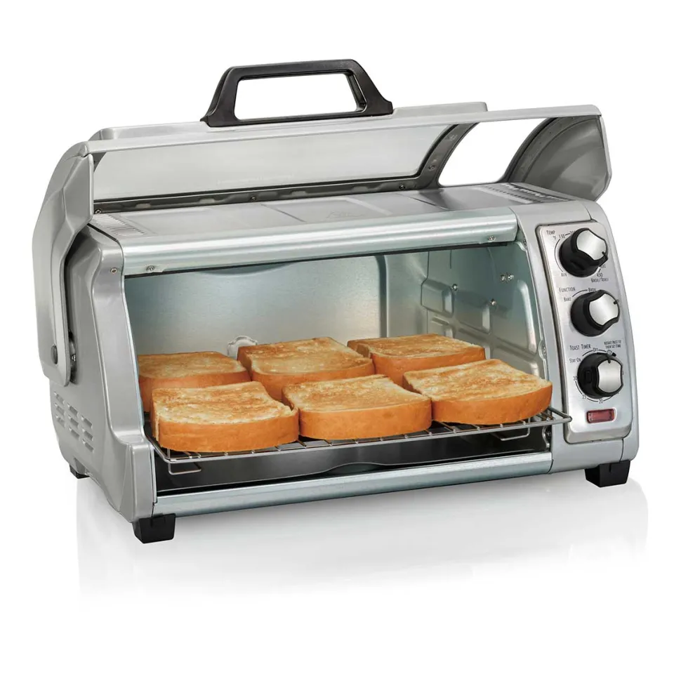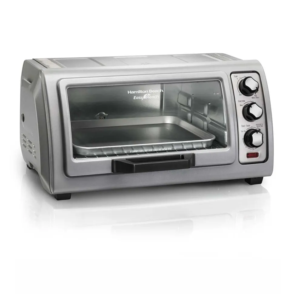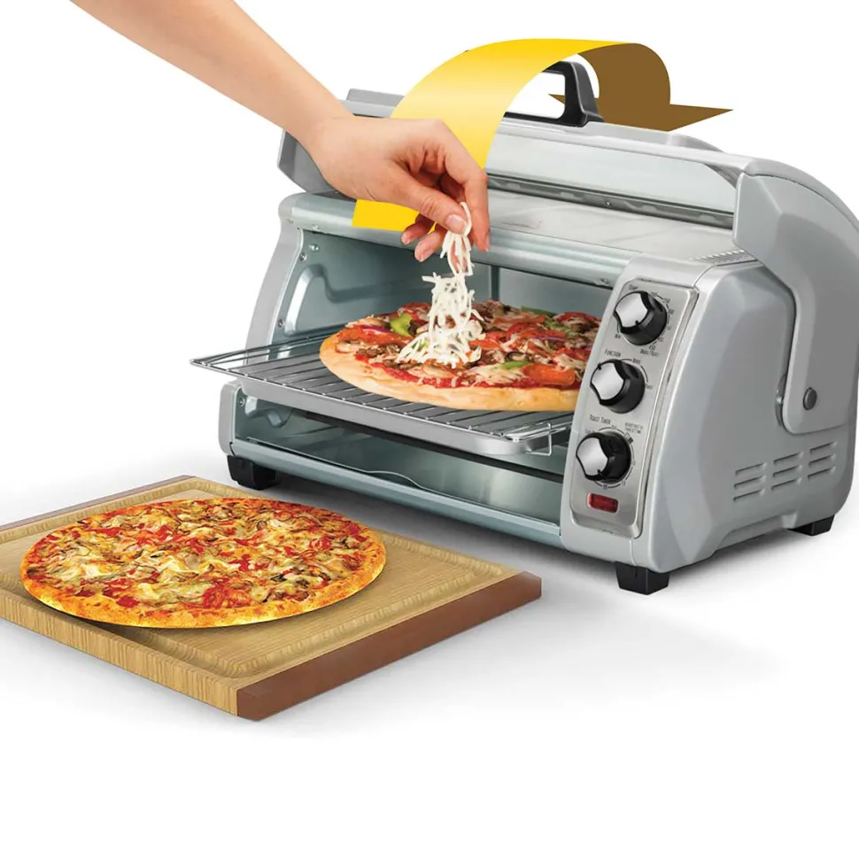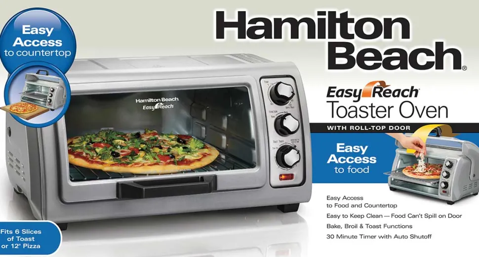 The Hamilton Beach® Easy Reach® Toaster Oven has a door that rolls up and stays out of the way to give you easy access to the oven without blocking your countertop. Because it stays up and out the way of drips and spills, the door doesn’t get as messy as traditional toaster oven doors. This toaster oven is the ideal size for everything from snacks to side dishes. It has a spacious interior that fits a 9″ x 11″ bake pan, 6 slices of toast or a 12″ pizza.