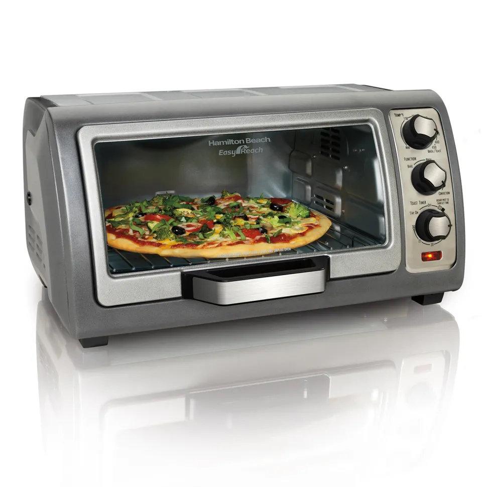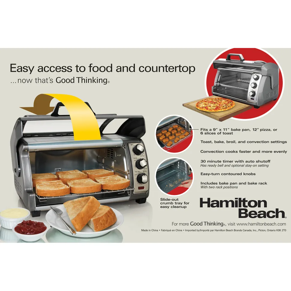You won’t find a design like the Hamilton Beach Easy Reach Toaster Oven with Roll-Top Door anywhere else. Its unique and large opening makes food easy to reach. And since the door opens above the oven, it frees up your countertop space in front. Best of all, it’s easy to keep clean because food can’t spill on the door. Contoured dials are easy to grip and turn, making it simple to switch between bake, broil and toast settings.The stay-on setting is safer thanks to a stop mechanism that prevents the knob from being turned to stay-on by accident.