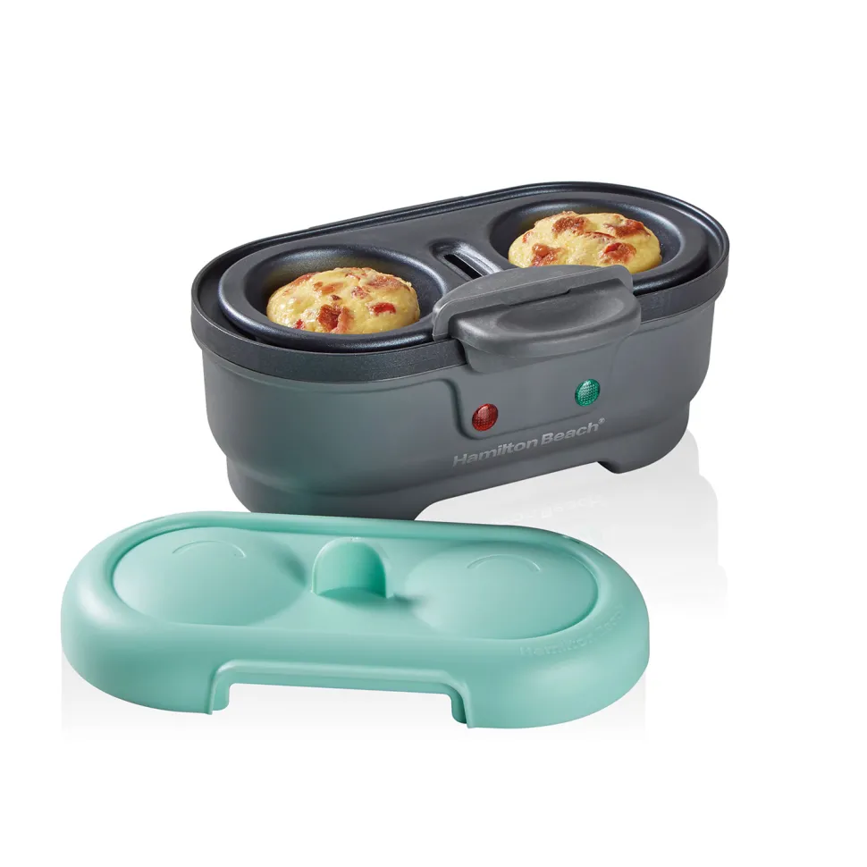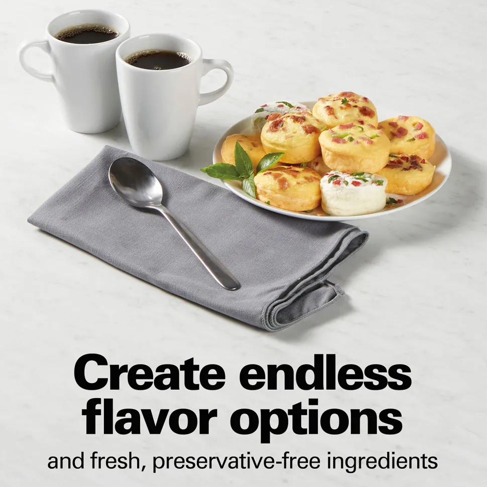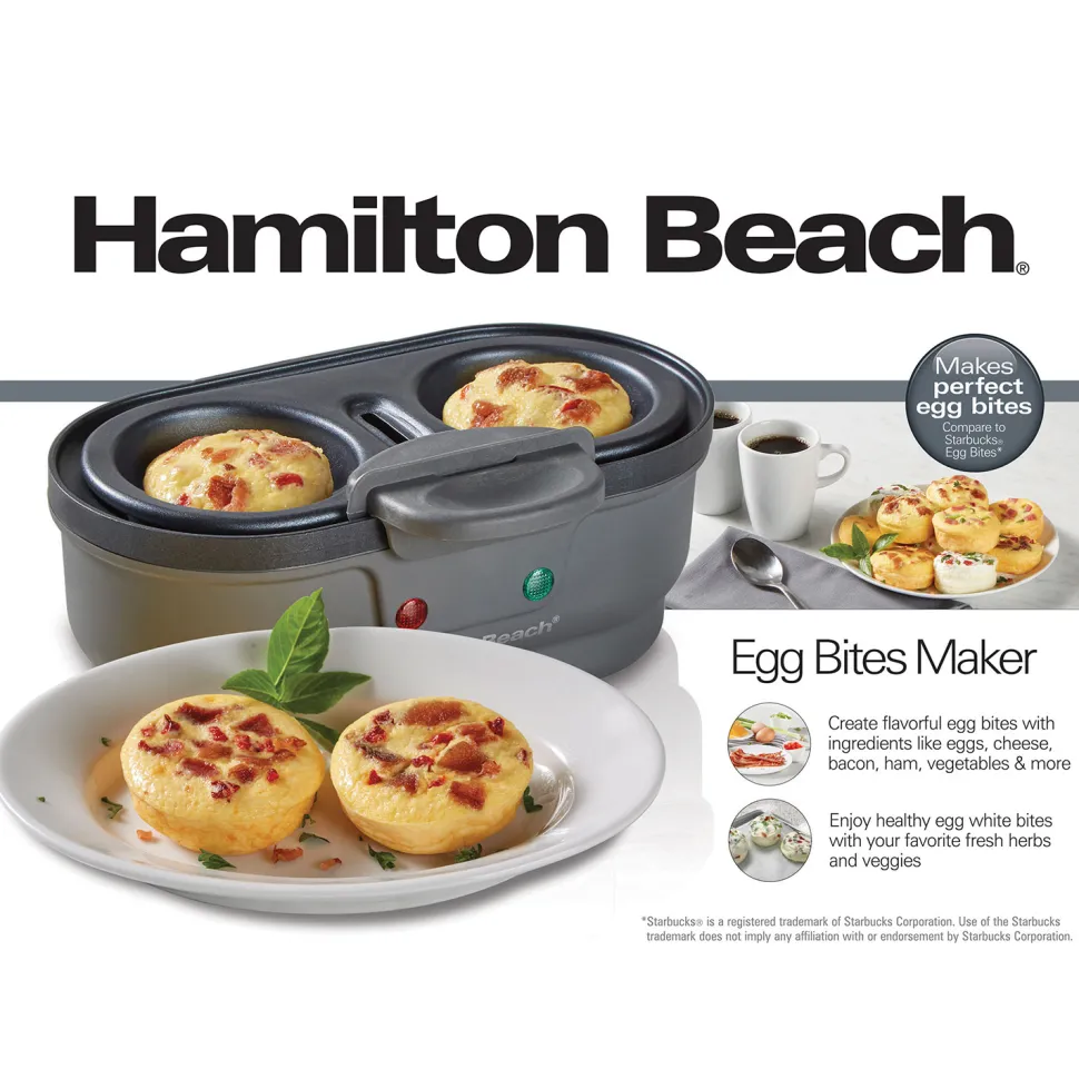 If you rely on Starbucks®* to satisfy your hunger for egg bites, save money and skip the trip to the coffee shop on your morning commute by making them at home with the Hamilton Beach® Egg Bites Maker. It lets you quickly and easily make your own velvety egg bites with fresh, delicious ingredients. And with the Hamilton Beach Egg Bites Maker, your choices are not limited — you can create an endless variety of egg bite flavors and combinations using your own fresh, preservative-free ingredients. In addition to making 2 egg bites, the Hamilton Beach Egg Bites Maker also expertly poaches 2 eggs. To make perfect egg bites or poached eggs, simply pour water into the base up to the fill line and fill the egg cups with your customized egg mixture or fresh eggs. In under 10 minutes, you’ll have a protein-packed, keto-friendly breakfast to enjoy at home or on-the-go. After cooking, the nonstick egg cup tray removes for easy cleanup in the dishwasher.