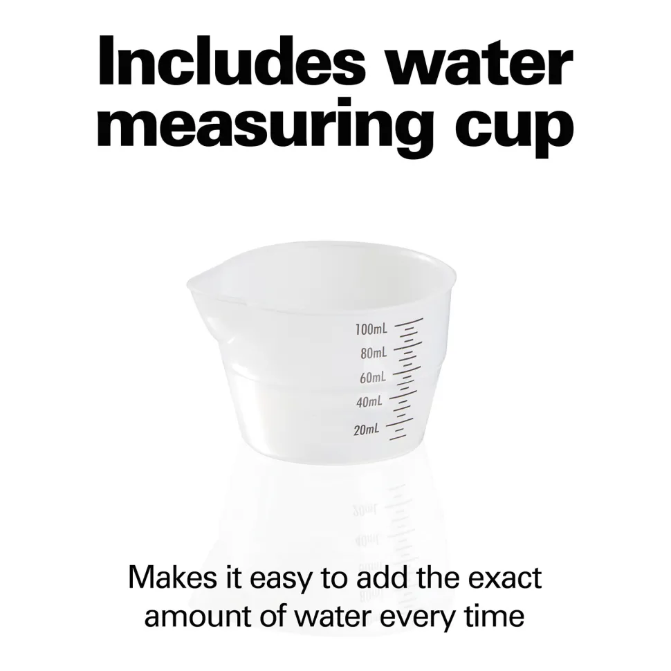 - Power and cooking lights Indicate when power is on and eggs are ready. Includes water measuring cup Makes it easy to add the exact amount of water every time.
