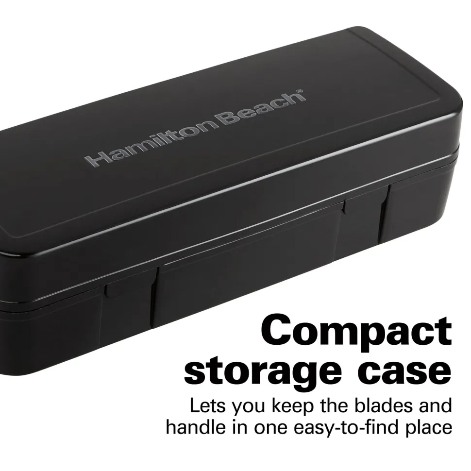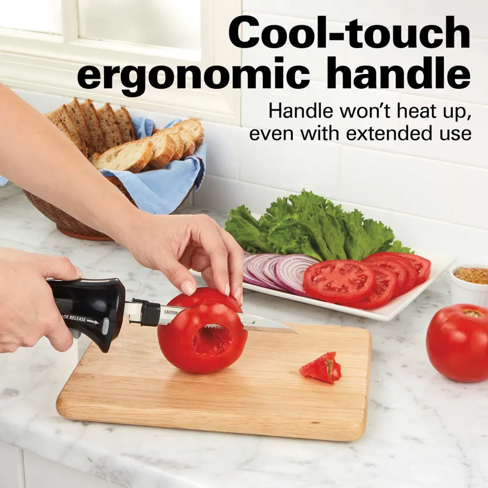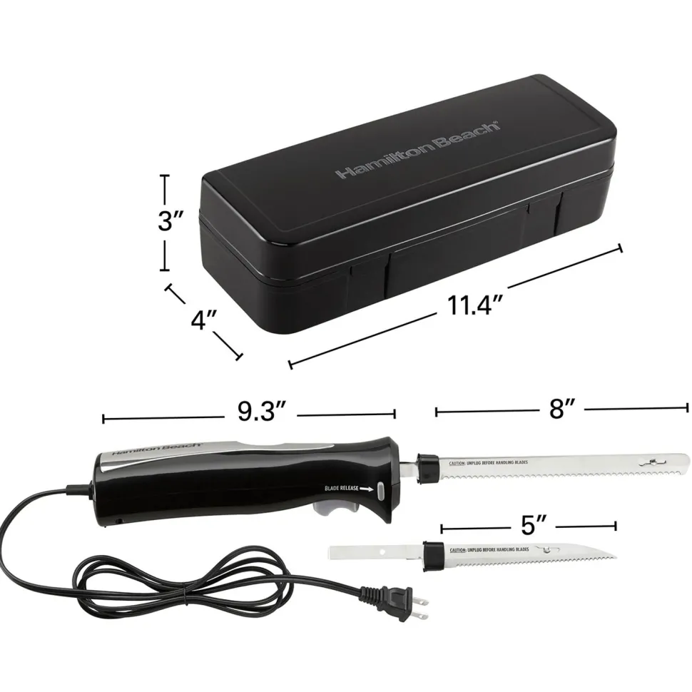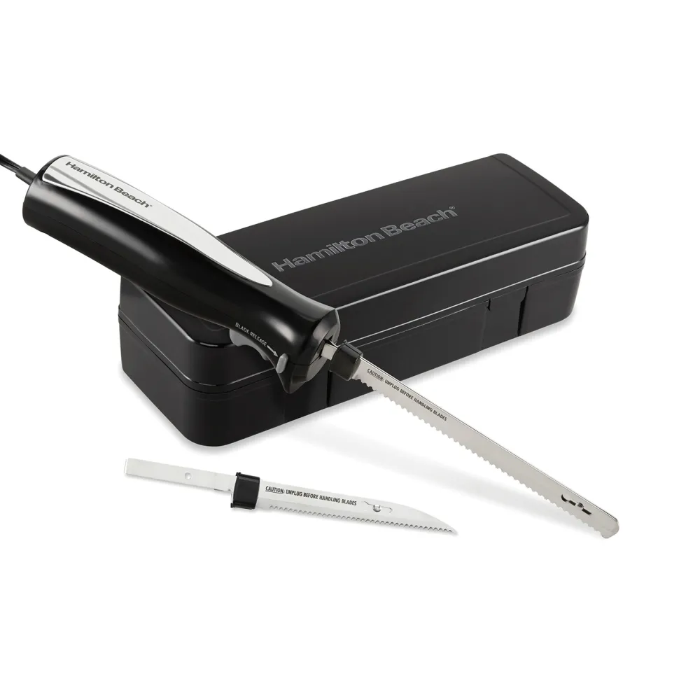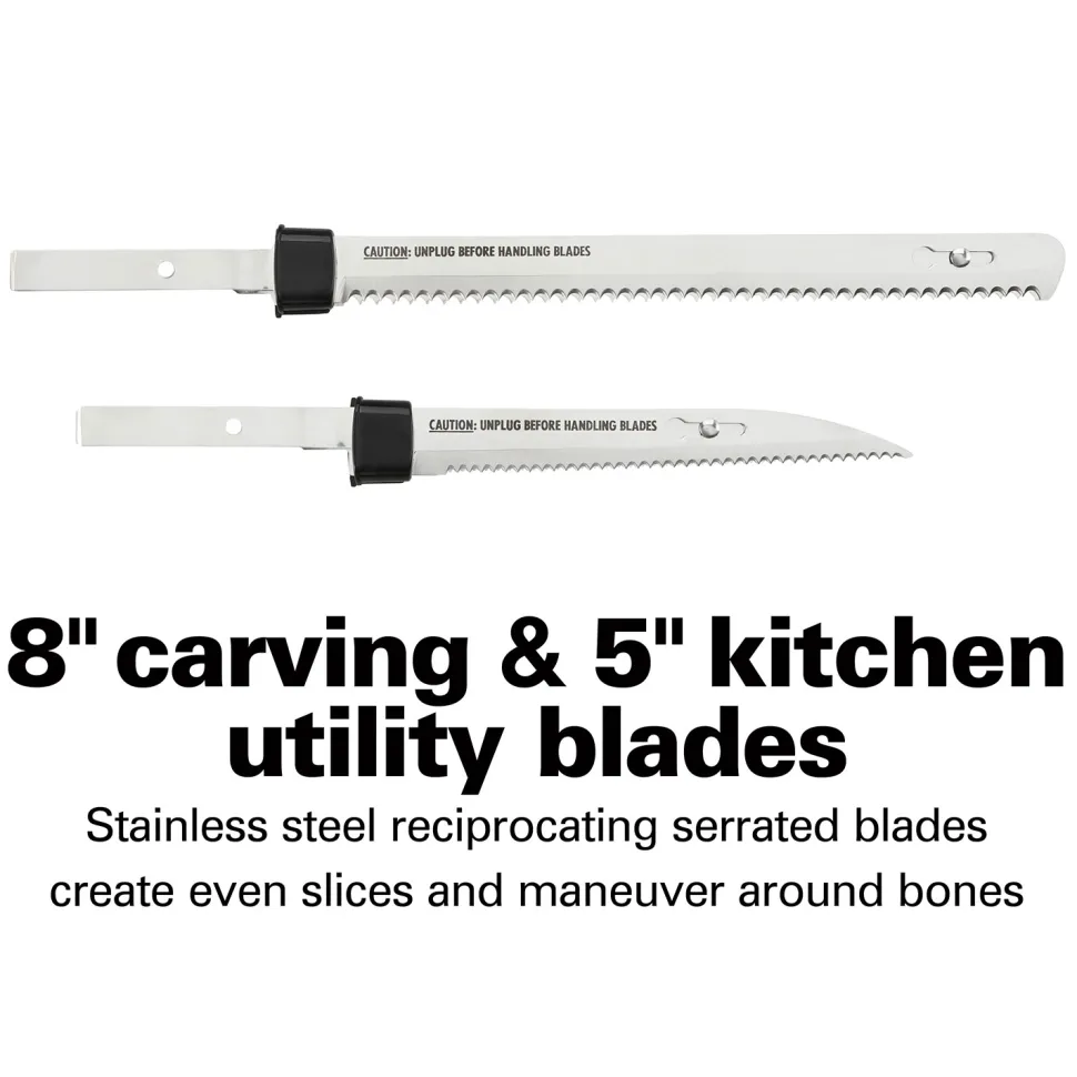 If you’ve ever used an electric knife, you already know that it’s the easiest way to slice and carve food evenly as well as reduce hand fatigue during large slicing jobs. If you haven’t tried one, it’s time to empower your slicing with the Hamilton Beach® Electric Knife Set with Storage Case. Once you try the power and ease of electric slicing and carving, you won’t miss manual cutting. The Hamilton Beach® Electric Knife Set with Storage Case is ergonomically designed and comes with two stainless steel blade sets with reciprocating, serrated blades that make easy work of almost every cutting job. Use the 8″ carving blades on large cuts of meat or to slice crusty bread. Use the 5″ kitchen utility blades for added precision and maneuverability when cutting around bones and skin or for precisely cutting fruits and vegetables. It’s even great for cutting foam for crafting and DIY projects. When finished, everything stores neatly in the compact storage case.