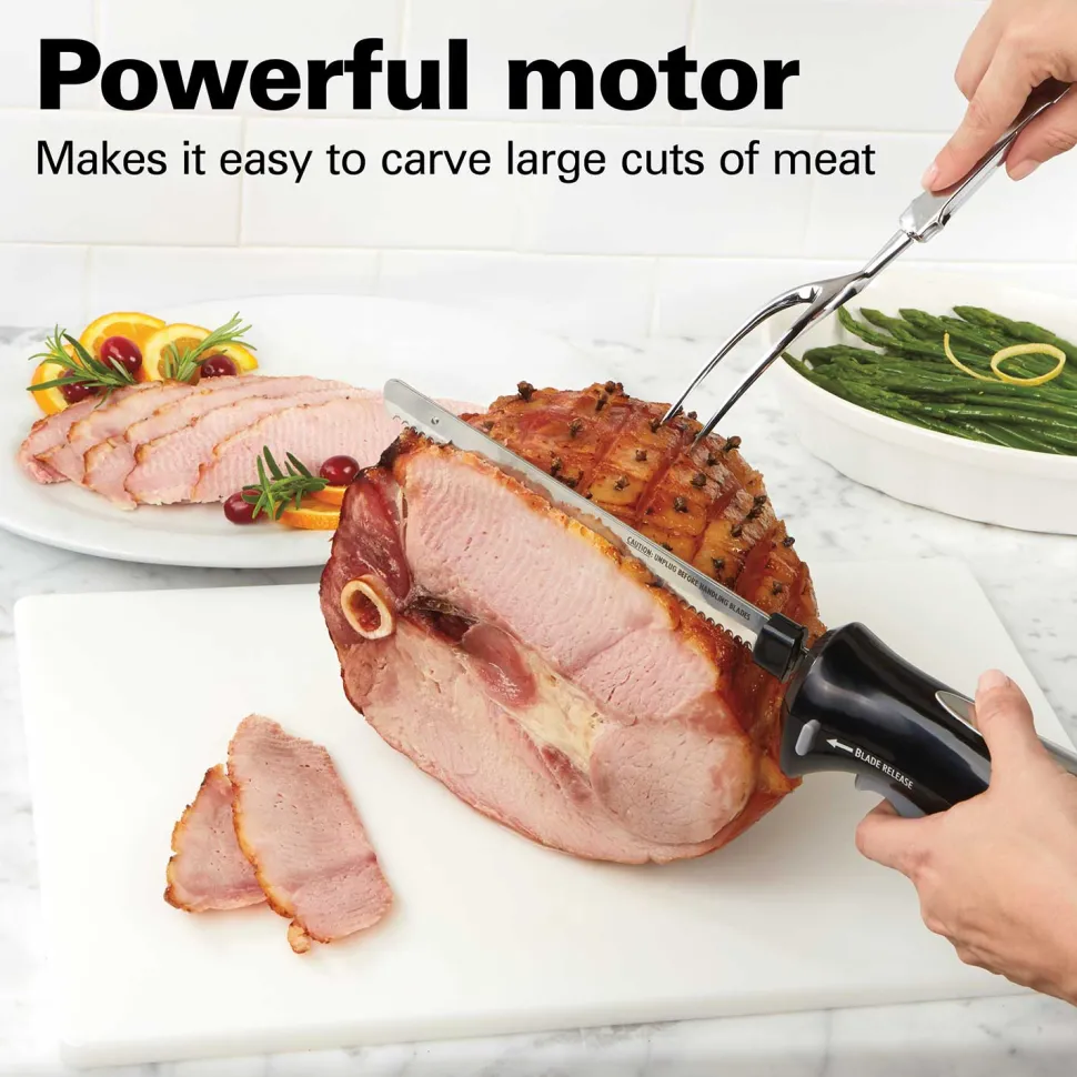 This is the best electric knife for every carving and slicing job. Stainless steel reciprocating serrated blades give you the control and precision to quickly create even slices and maneuver around bones.