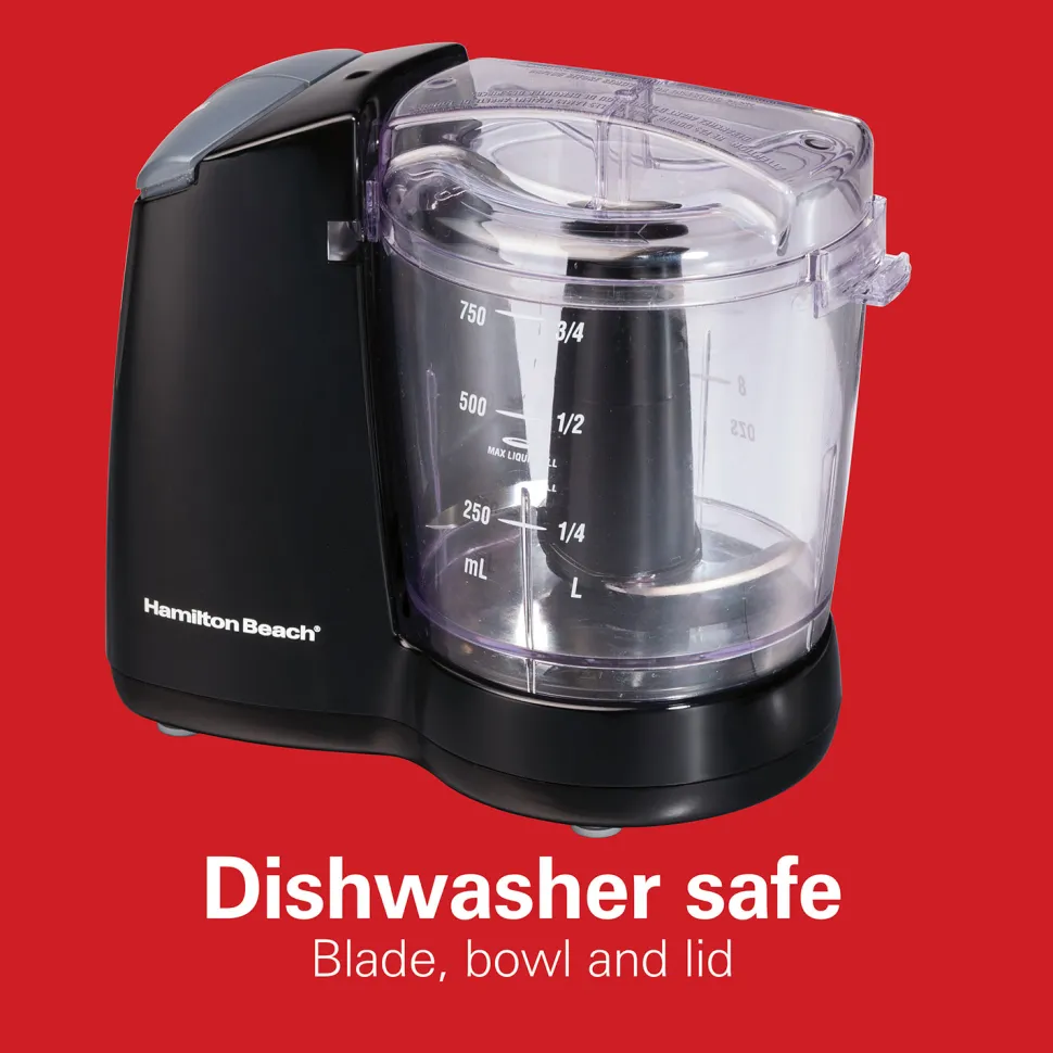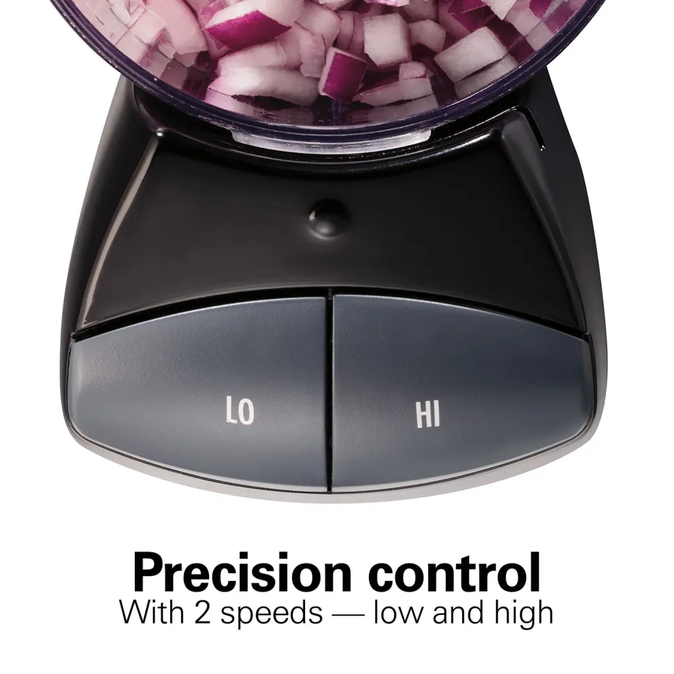 The versatile Hamilton Beach FreshChop™ 3 Cup Food Chopper is the perfect size for everyday use. Make delicious homemade salsa, mix eggs for creamy omelets, emulsify your favorite sauces, puree baby food, chop onions, and more. You get precision control with two speeds to choose from so you get the perfect texture every time, whether you want smooth sauces or chunky bits of onion and peppers in your salsa. The stainless steel blades efficiently cut through all kinds of ingredients from carrots and onions, to garlic and nuts.