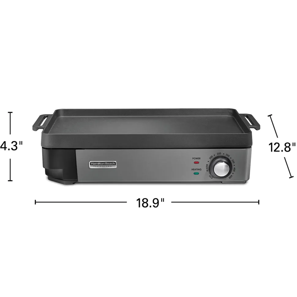 The Hamilton Beach® Professional Cast Iron Electric Grill has a large 10″ x 16″ cooking surface that’s perfect for preparing complete family meals and breakfasts that are too large for a skillet. It will be your go-to grill for cooking everything from steaks and burgers to chicken, fish and vegetables like a pro. It sears meats and other foods on high heat to lock in delicious flavor for professional results. The temperature is adjustable from warm up to 450° F. The grill surface is made of durable cast iron that is preseasoned to reduce sticking and to save time and effort. Cast iron is a hard surface that is naturally scratch-resistant even when using metal utensils. Cast iron also holds heat better than aluminum for evenly browned and cooked foods. With the convenient drain, it’s easy to push excess grease into the removable drip tray that slides out for easy grease disposal or recycling. The drip tray is top-rack dishwasher safe and the removable cooktop easily wipes clean. The cord wrap keeps excess cord off the countertop and reduces clutter. The grill is backed by a 3 year limited warranty.