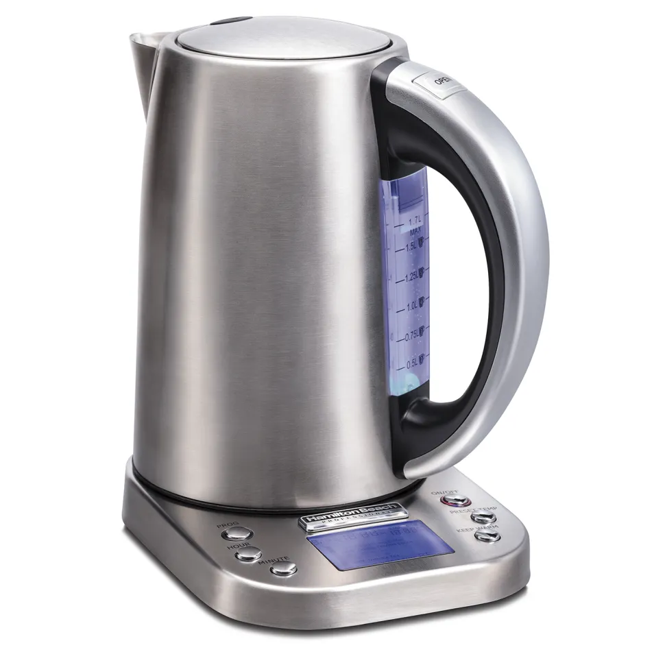 The Hamilton Beach Professional Digital Kettle boils water ultra-fast for tea, pour-over coffee, hot chocolate, soups and more. Digital controls, 6 pre-programmed settings, an LCD readout and programmable start time offer maximum control.