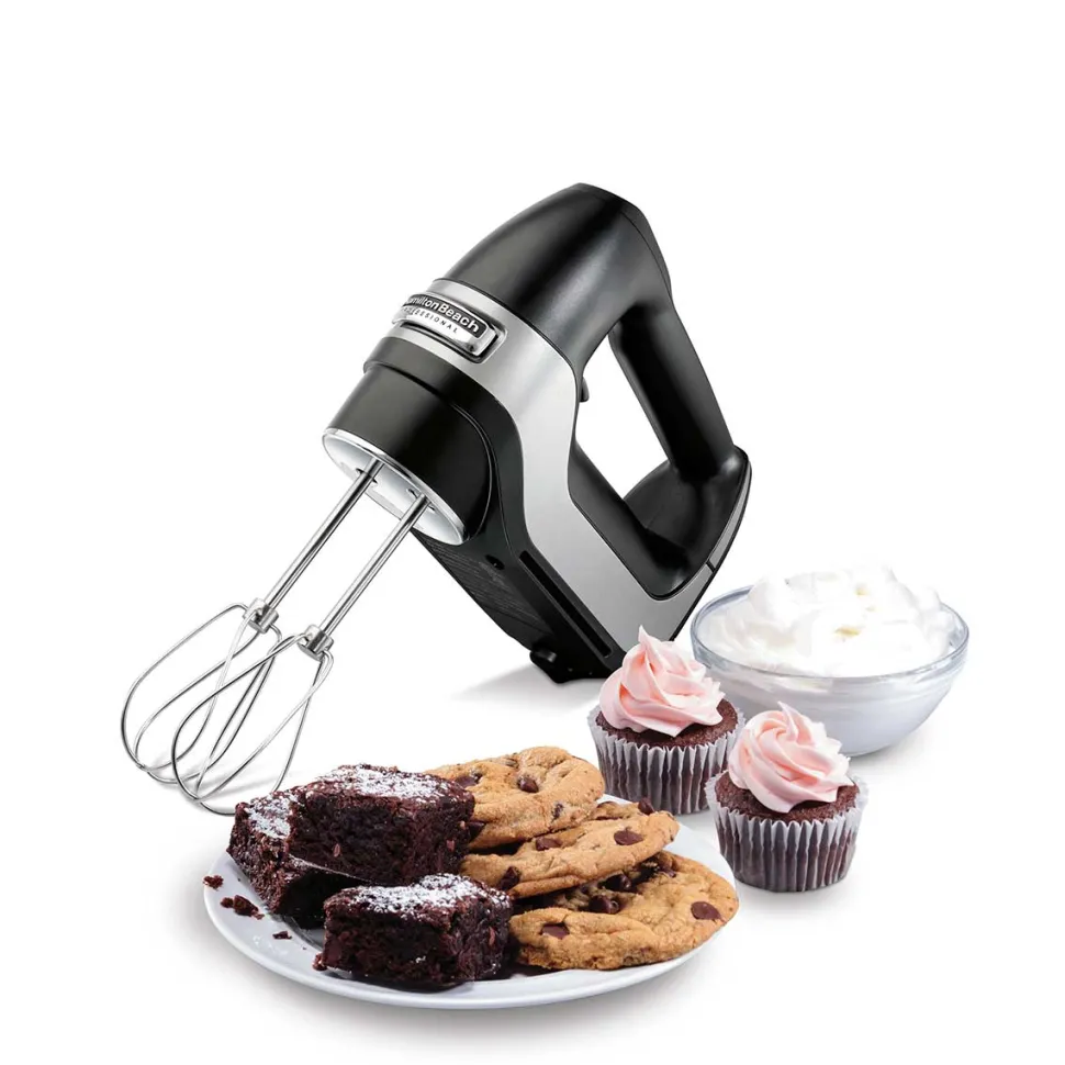 Whether it’s lighter-than-air whipped cream or chewy chocolate chip cookie dough, you can mix ingredients effortlessly with the Hamilton Beach Professional 5-Speed Hand Mixer. Lightweight and powerful, this mixer has a slow start that prevents splatters, no matter what you’re mixing. Push the QuickBurst button for an extra punch of power at any of the five levels. A lockable swivel cord, snap-on storage case and trigger-release makes mixing easy from start to finish. Powerful, Effortless Mixing From mashed potatoes to whipped cream, this professional-grade hand mixer gives you the power and control to mix and blend with ease. Slow Start Reduces Splatters Prevent clouds of flour and splatters of dough by starting slow and gently increasing speed. The vent design and the matte finish make it easy to wipe the mixer clean. Snap-On Storage Case with Beaters & Whisk Keep everything in one place. Stainless steel beaters and whisk are dishwasher-safe. 5 Speeds with QuickBurst at Every Level Adds a quick burst for a slow, gentle mix or for a fast whip. Swivel Cord Lock Swivel cord lock lets you adjust the cord to stay out of your way during mixing, whether you’re left or right-handed. Trigger Release for Attachments With a quick pull of the trigger, attachments release when you’re done mixing. Use of the marks does not imply any affiliation with or endorsement by Whirlpool Corporation. Hamilton Beach Professional Inspired by our 100 years of experience designing products used in commercial kitchens, Hamilton Beach® Professional is a line of countertop kitchen appliances with professional-level components designed to deliver exceptional performance and superior durability for the serious home cook. Thoughtful features like precise speed control, convenient pre-programmed settings, and powerful motors to push through any job will make your time in the kitchen easier and more enjoyable.