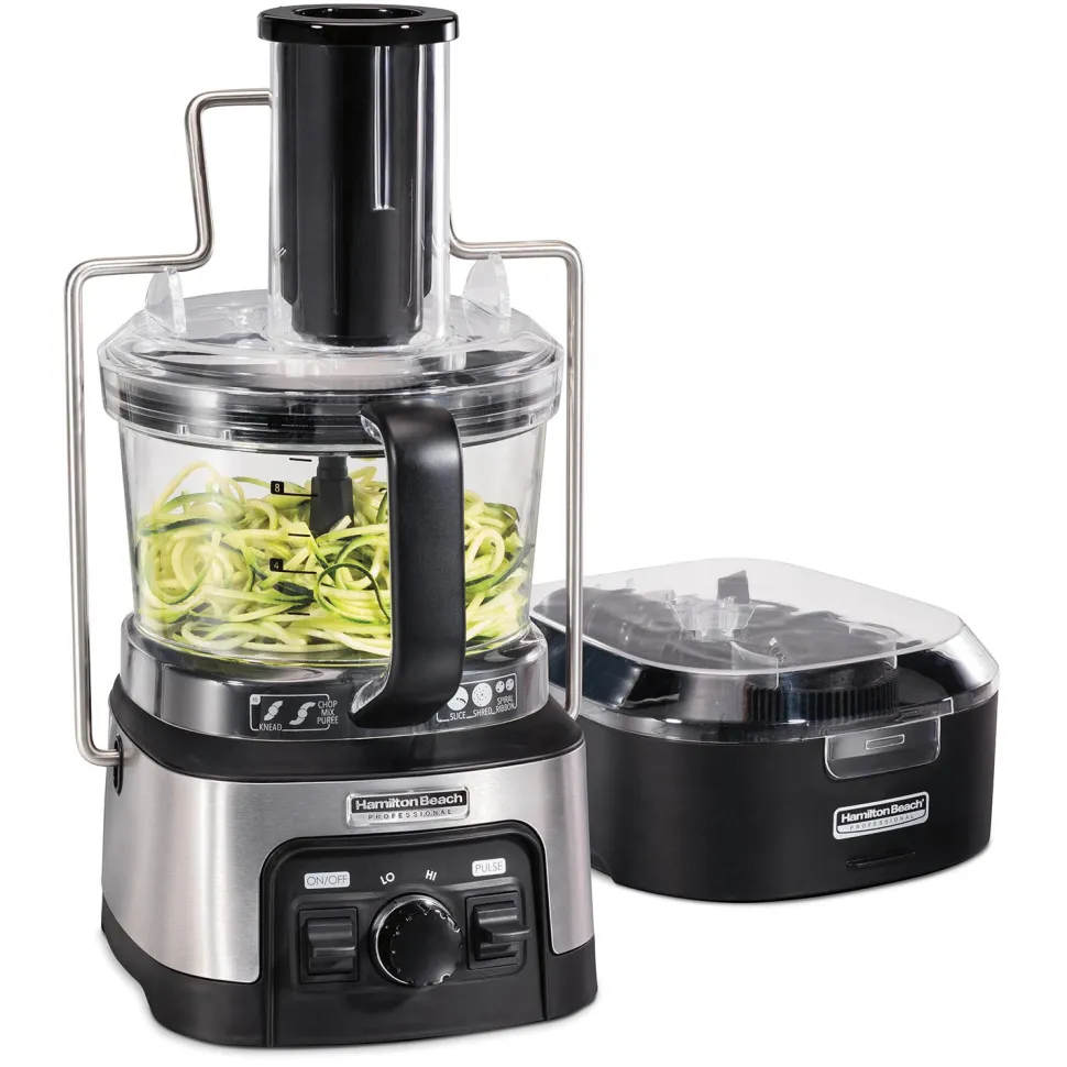 The Hamilton Beach® Professional Spiralizing Stack & Snap™ Food Processor comes with 6 versatile attachments for spiralizing, slicing, shredding, chopping, pureeing, and kneading. Turn veggies into linguini-like noodles or wide ribbons for delicious side dishes or to replace pasta in your favorite recipes. Making your own is much more affordable than buying packaged veggie “noodles” in the grocery store. This food processor features a large 12 cup capacity and an extra-large 3″ round continuous feed chute that fits whole foods and reduces the need for pre-cutting. It comes with a spiral blade for veggie noodles, ribbon blade for veggie ribbons, adjustable slicing blade with 6 thickness settings, reversible shredding blade for coarse or fine shreds, an S-blade for chopping and pureeing, and a dough blade for kneading. The food processor’s easy-to-assemble stack and snap design is intuitive and requires no difficult twisting or locking. The 450 watt motor with 2 speeds and pulse has the power to process all types of ingredients. The large, leak-free sealed bowl with pour spout prevents messes. The handy storage case keeps accessories organized, accessible, and all in one place.