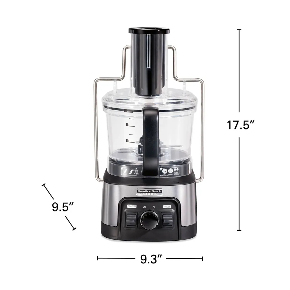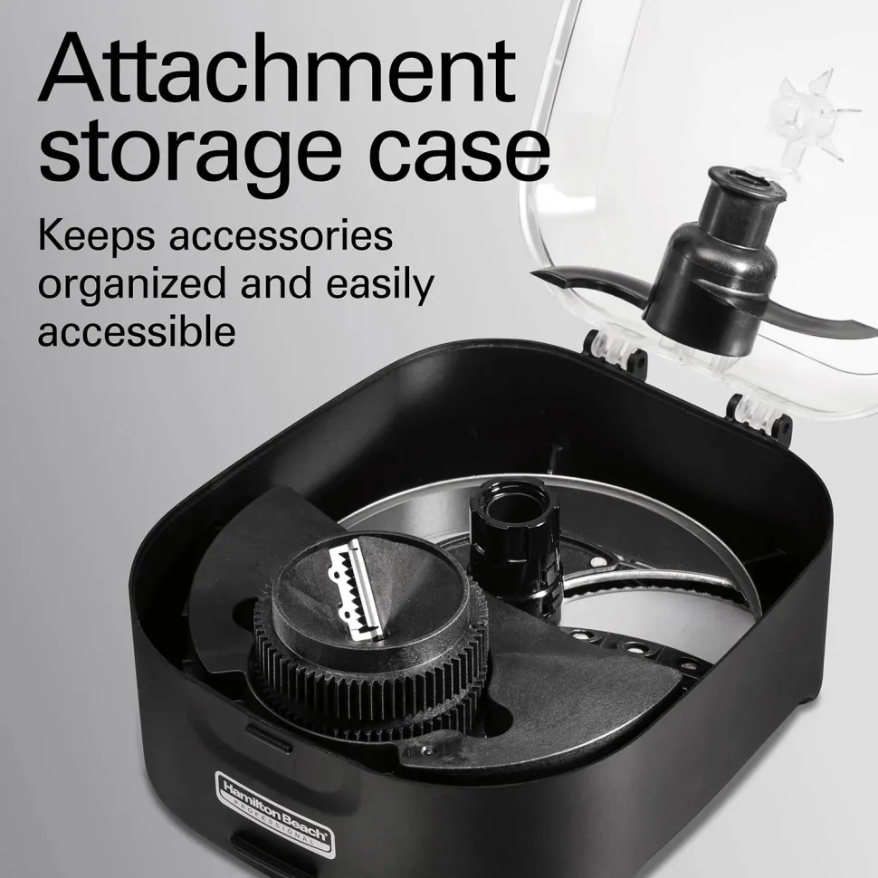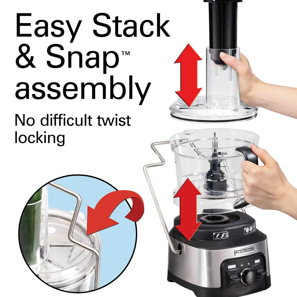 The unique design of the Hamilton Beach food processor requires no difficult twisting and locking. The bowl stacks easily on the base and a metal locking arm secures the lid to the bowl.